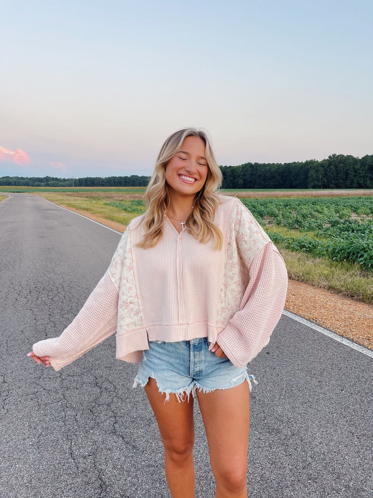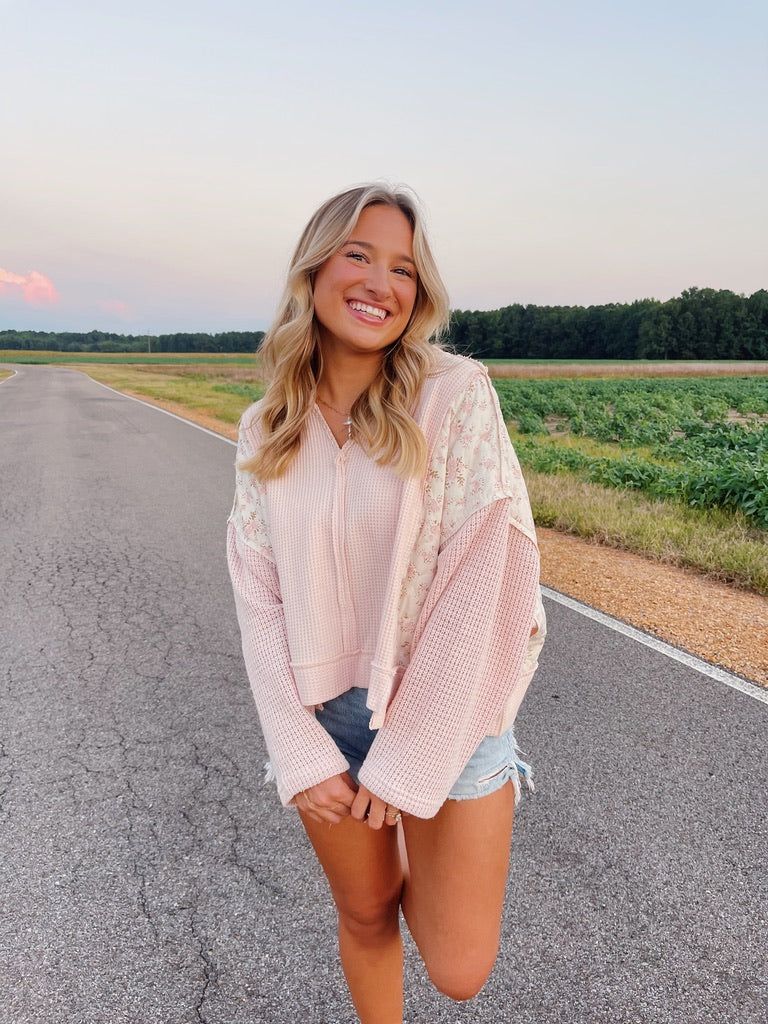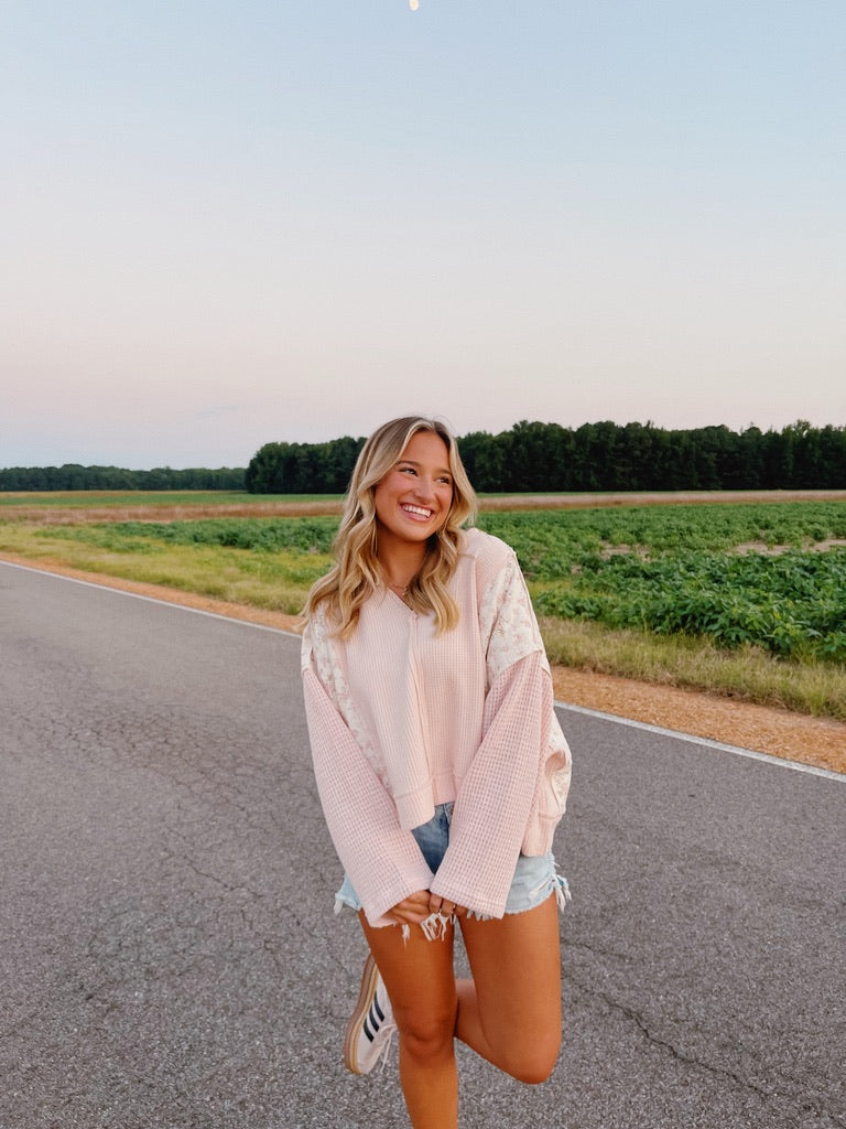 The cutest pullover for the fall transition! It runs oversized. Hallie is wearing a small.