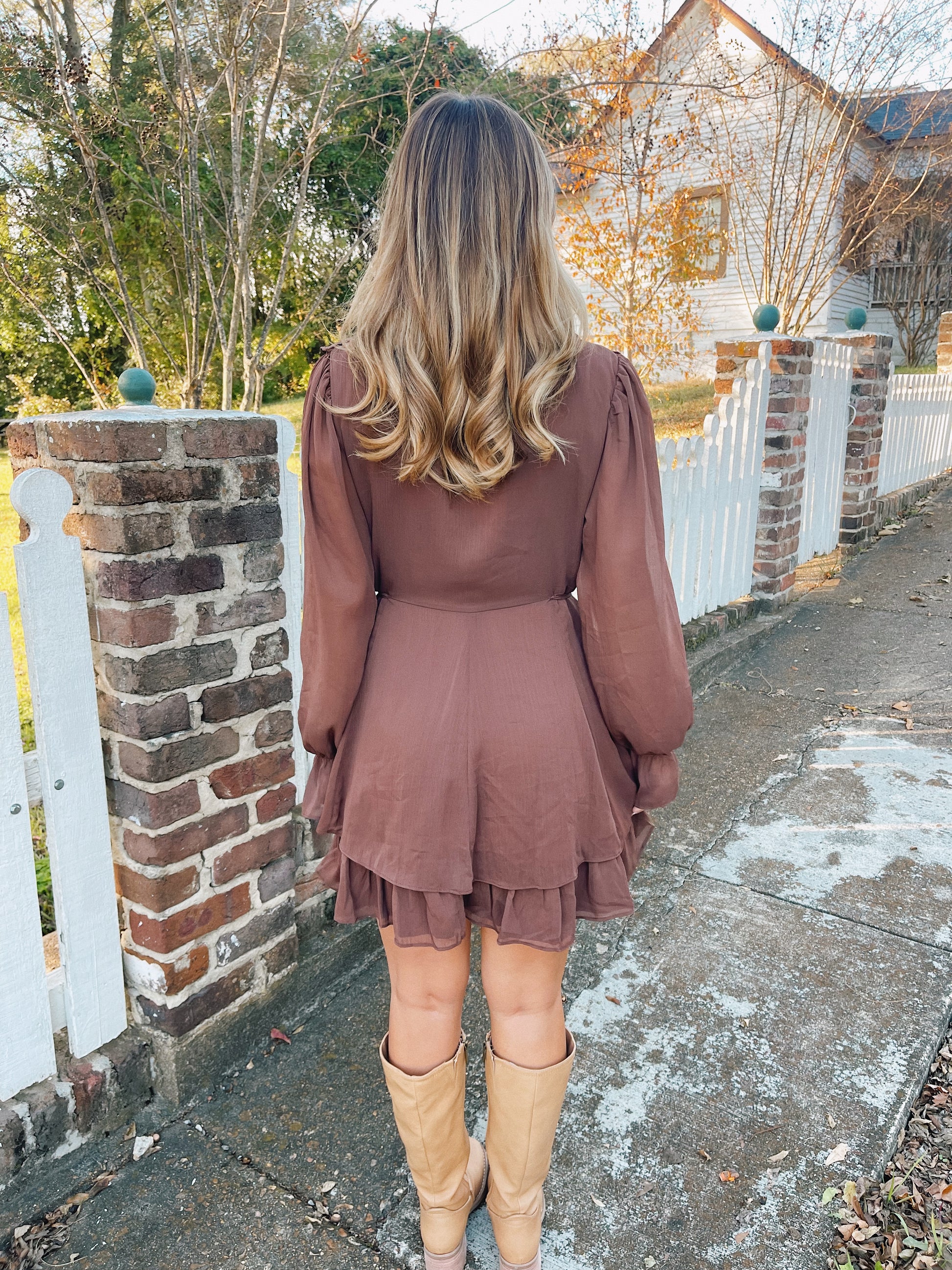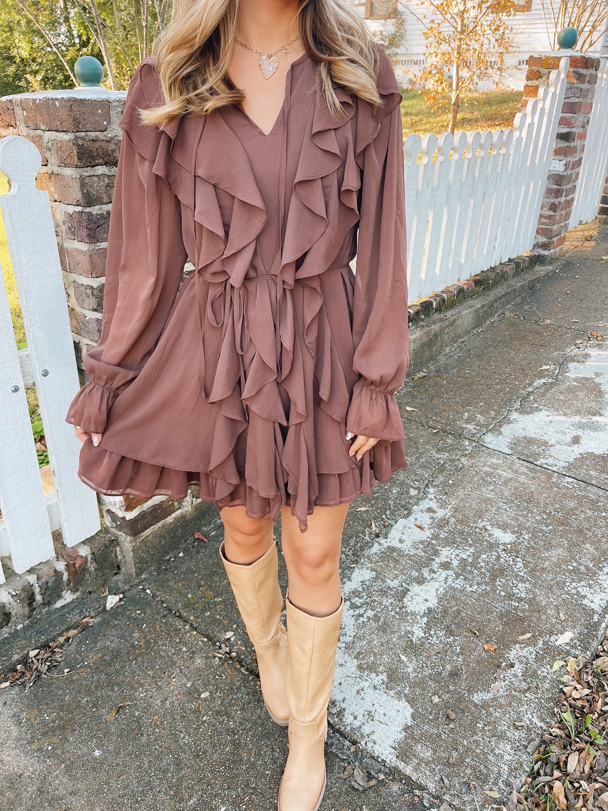 Pair this dress with your favorite fall boots! It runs true to size. The model is 5'3 and wearing a small.