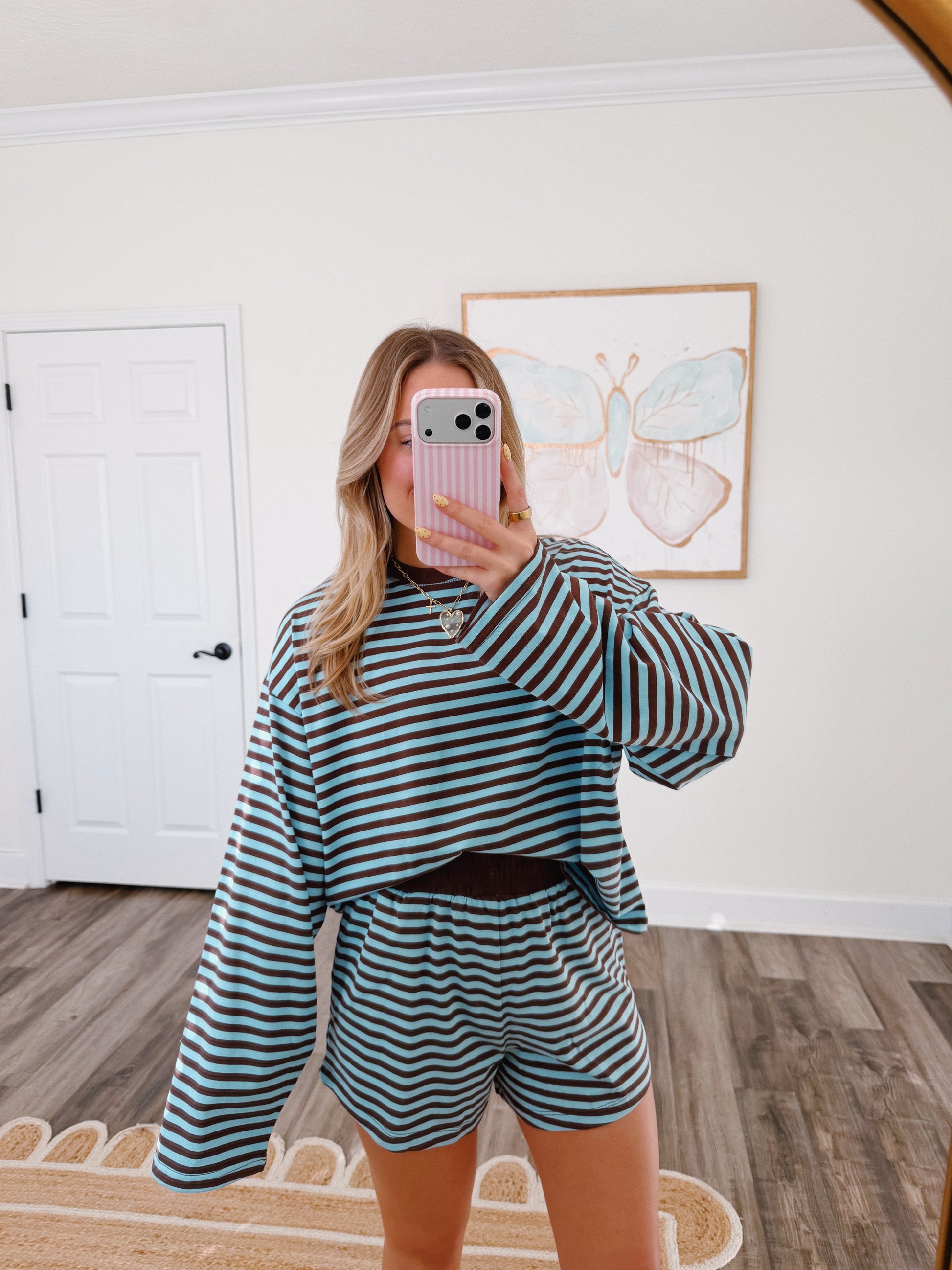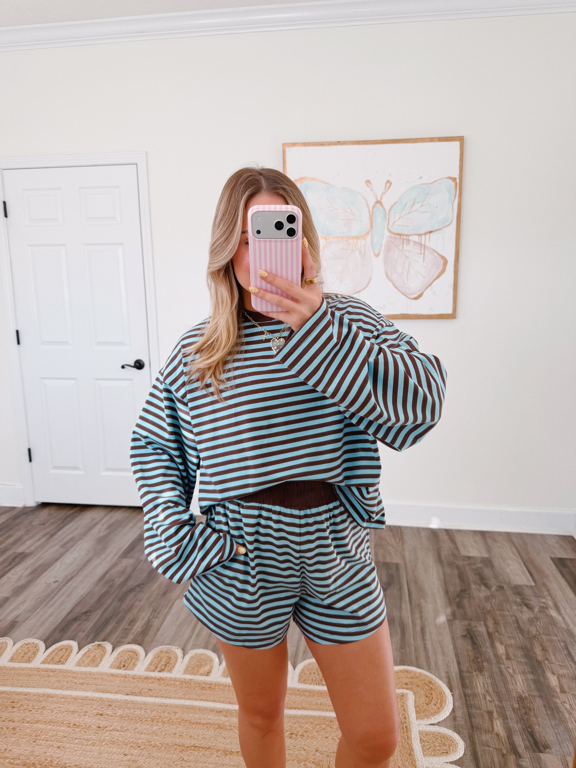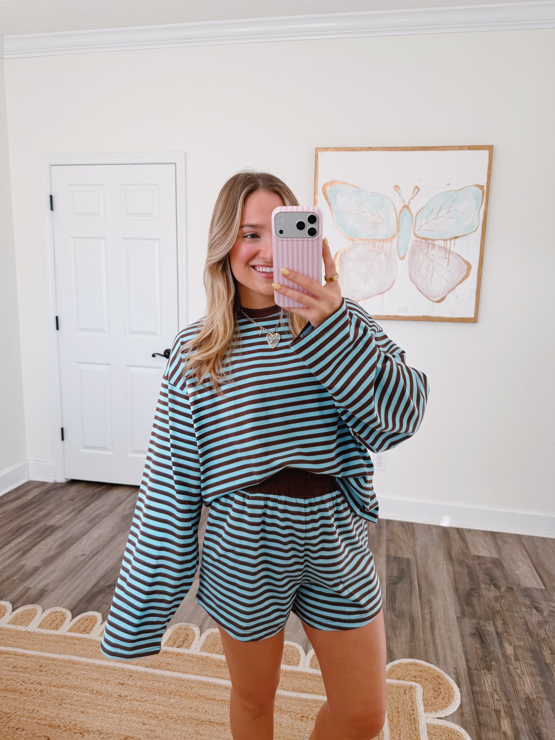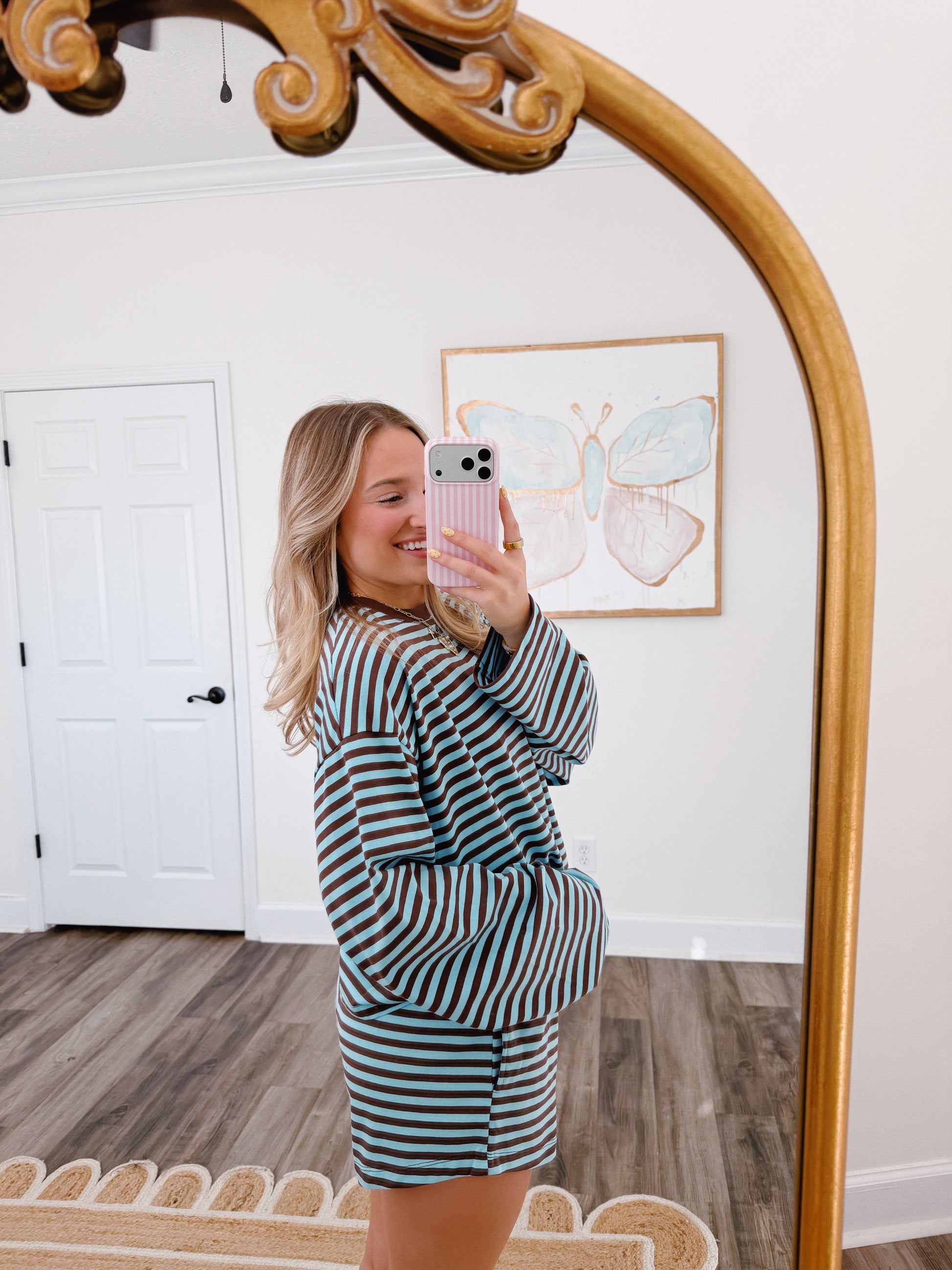 We are loving this color combo! It runs true to size with a roomy fit. The model is 5'3 wearing a small for reference!