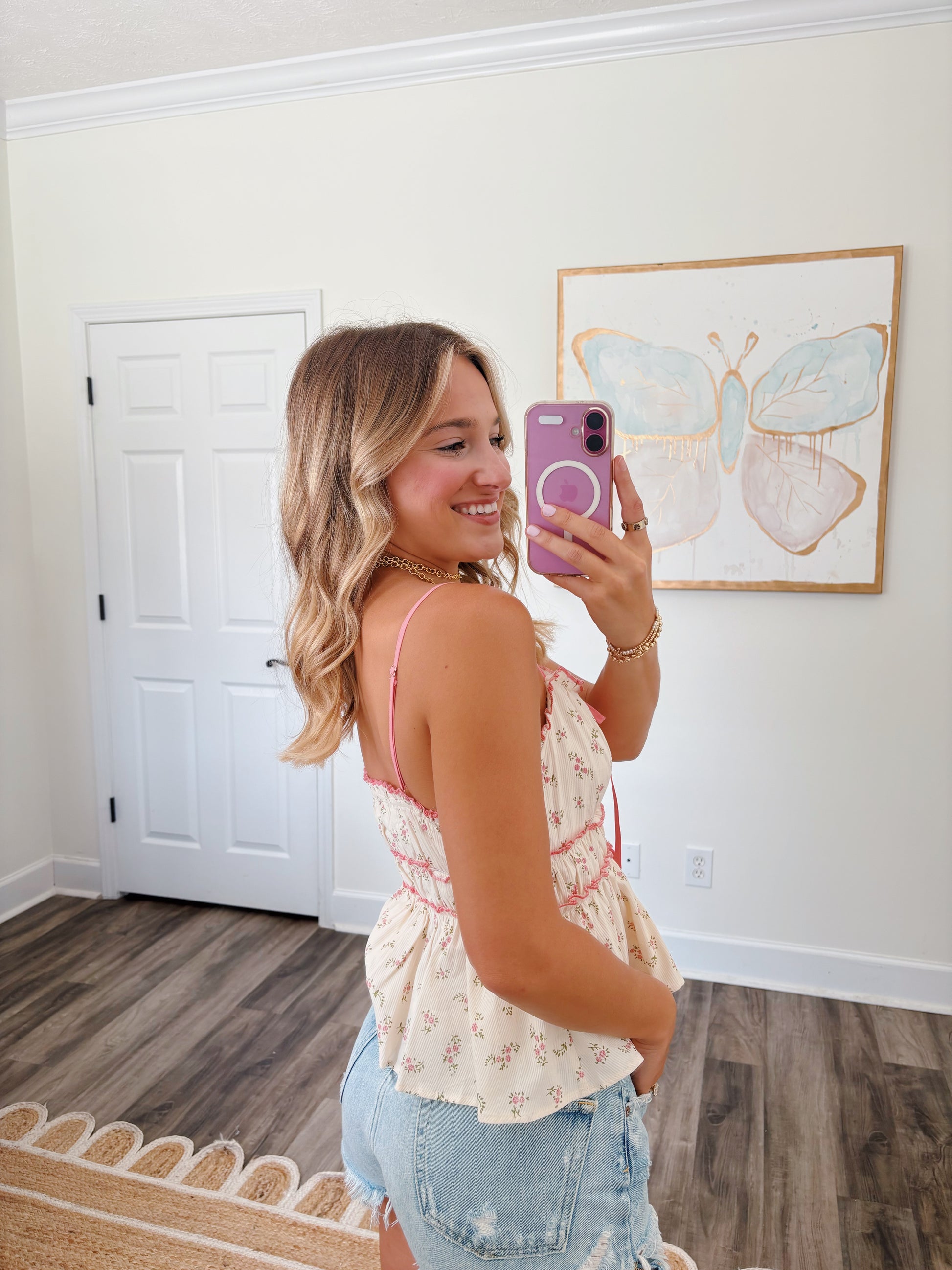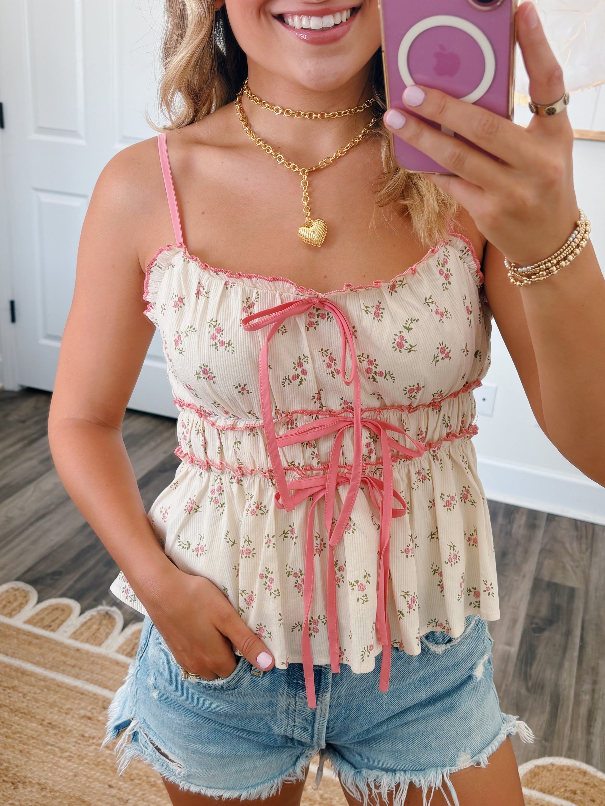 The cutest tank for summer!! Pair it with jean shorts or any denim. It runs true to size. The model is wearing a small.
