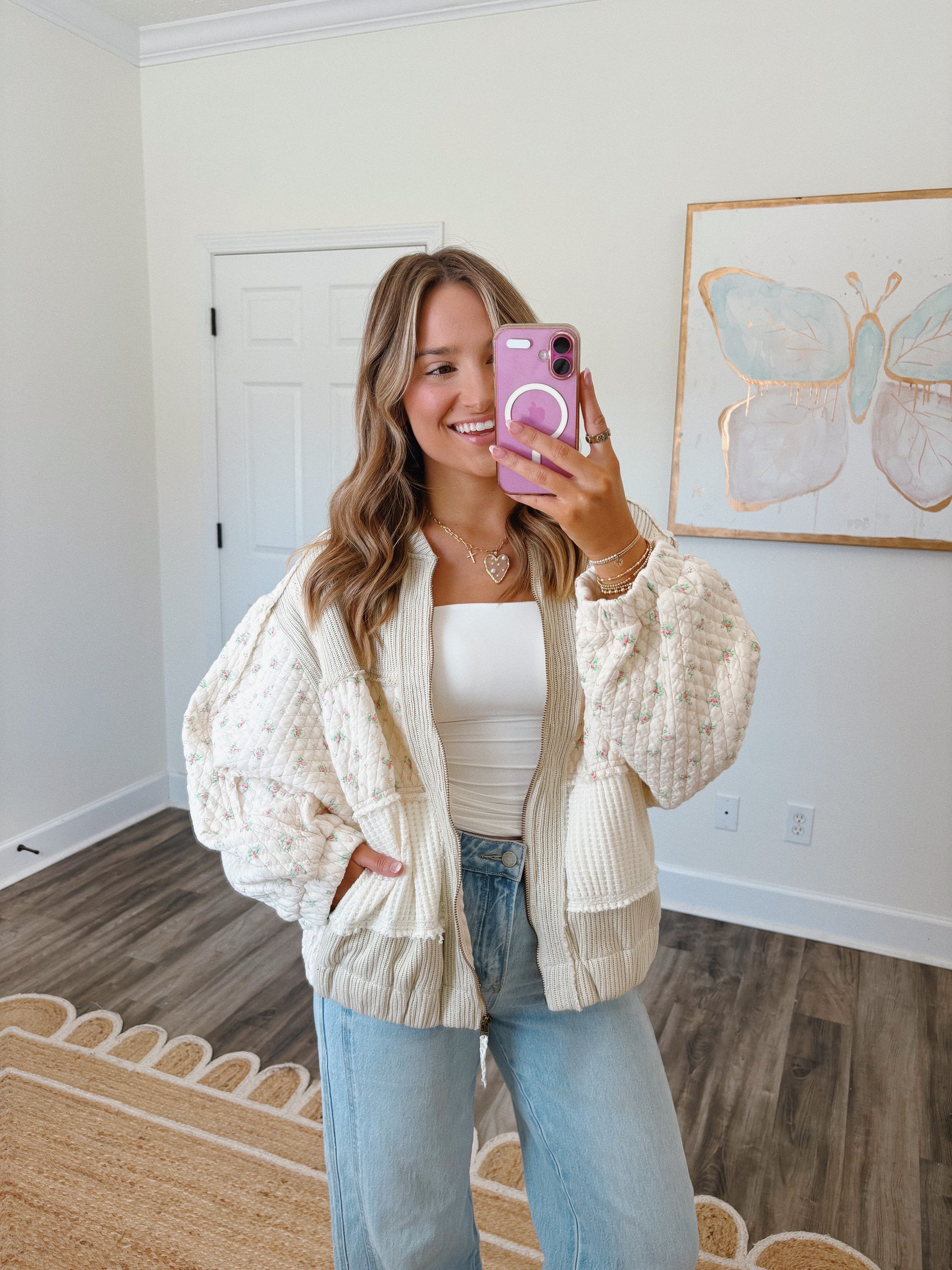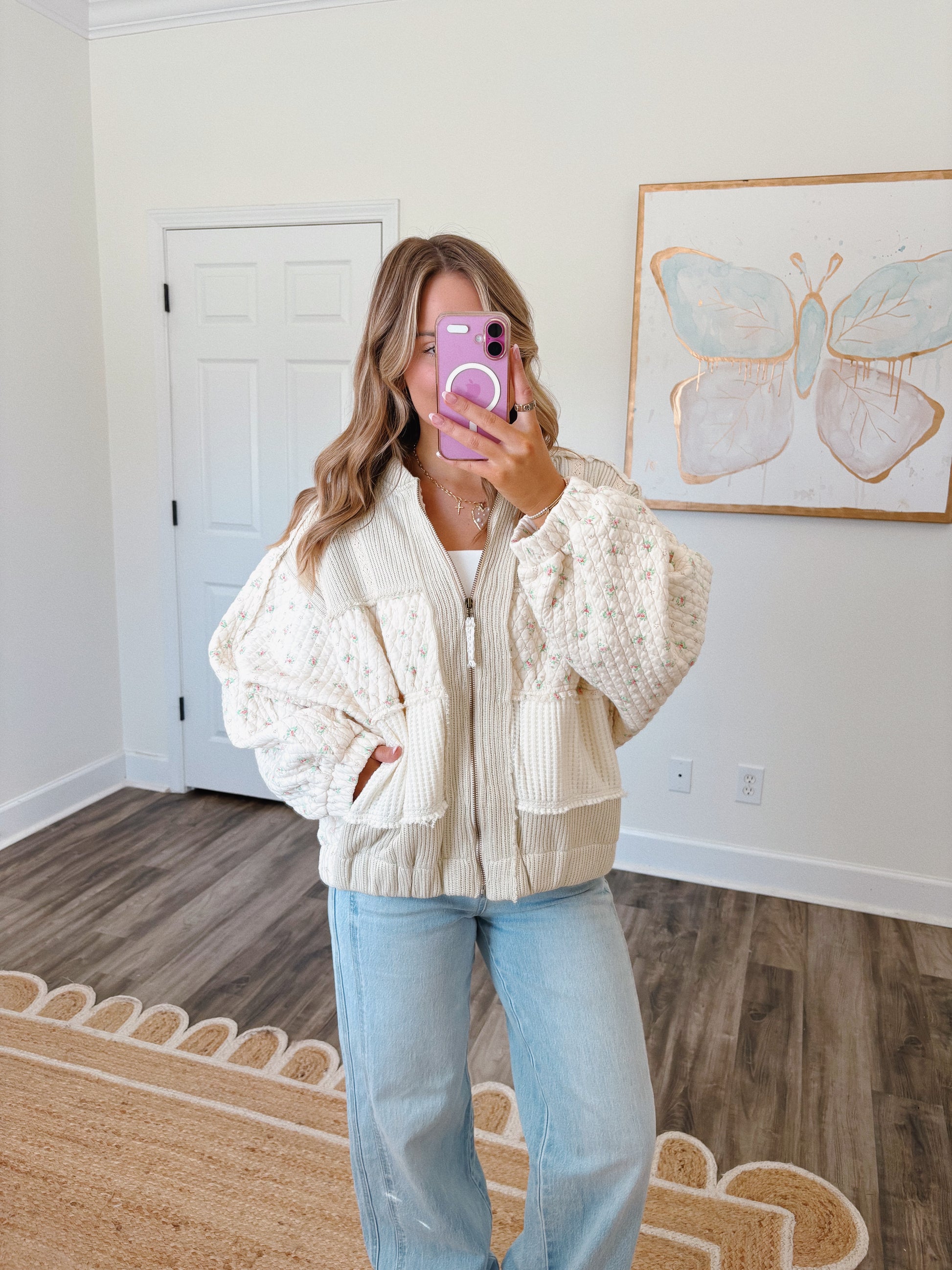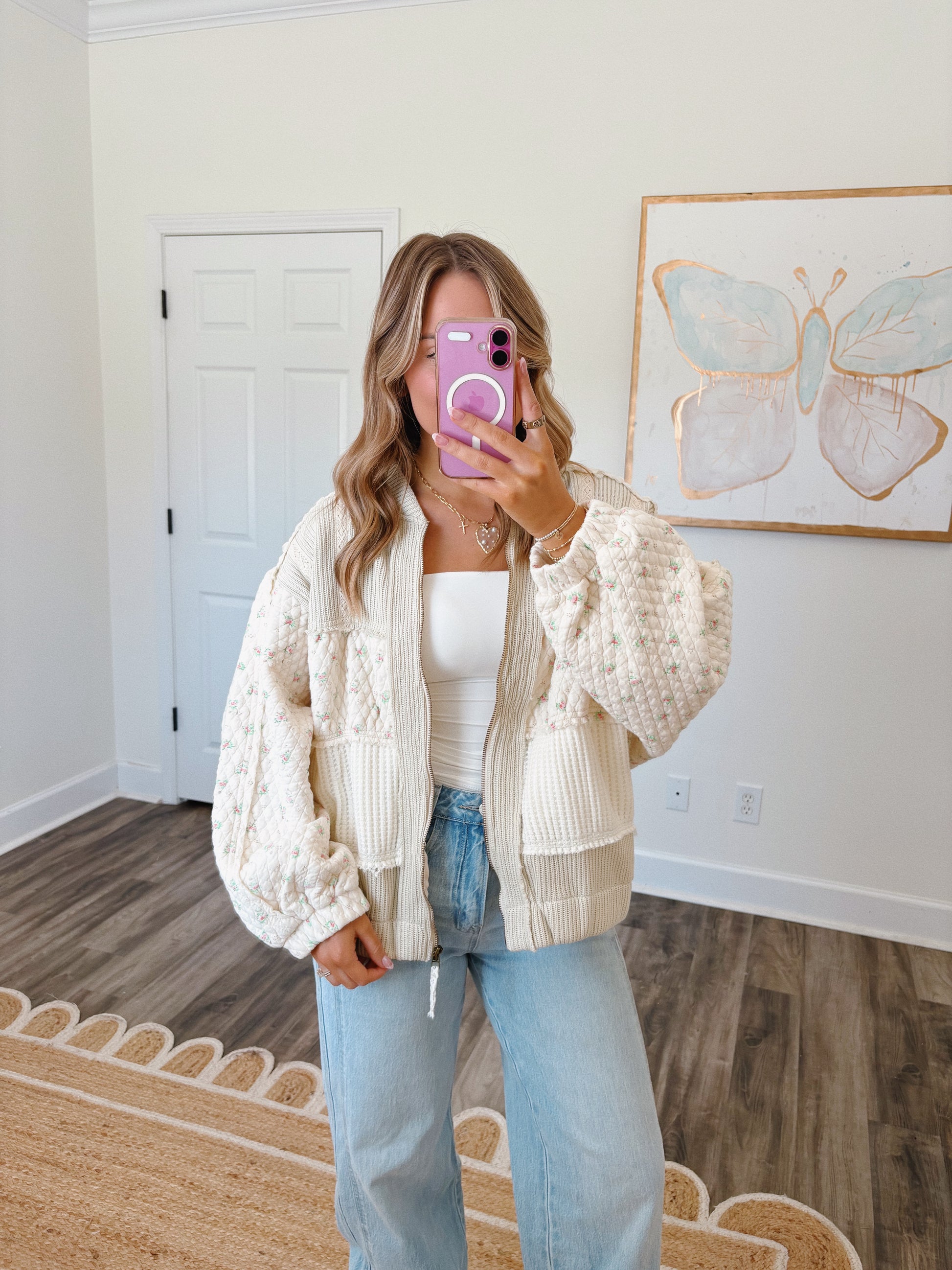 Wear this jacket with your favorite pair of jeans or leggings! It has a slightly oversized fit and is made with a thick material, perfect for the fall weather. The model is wearing a small.