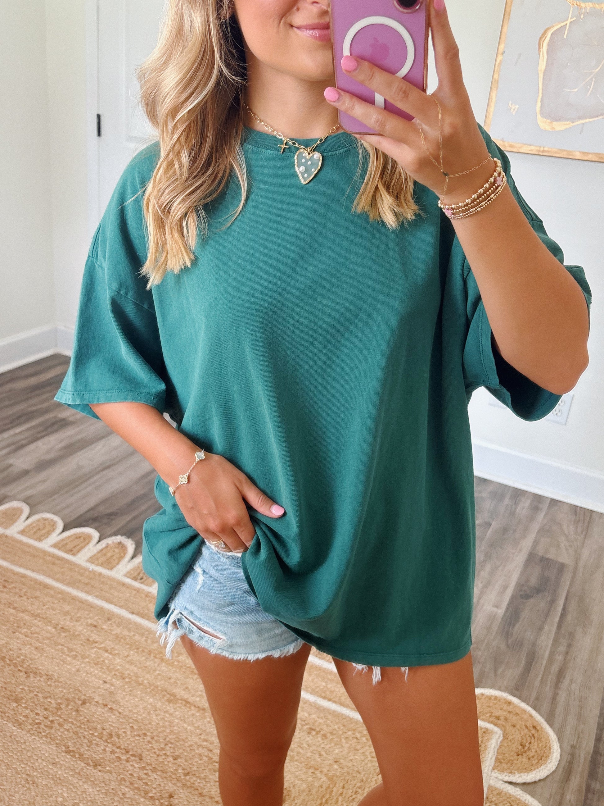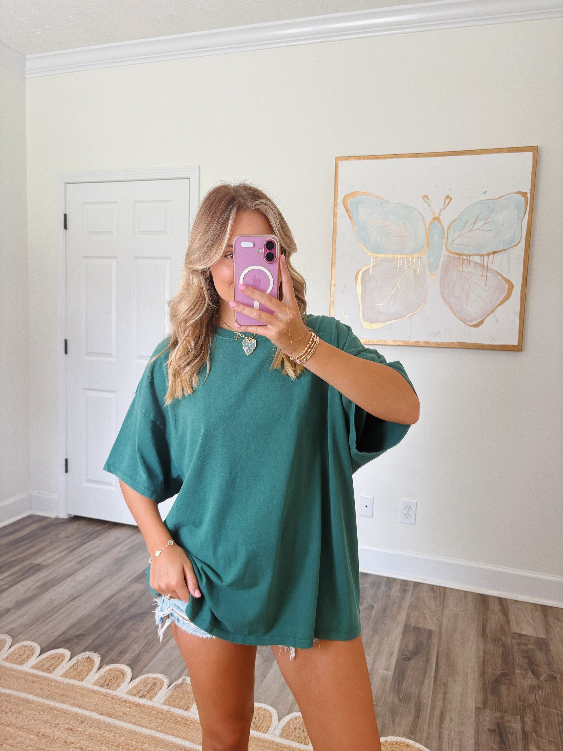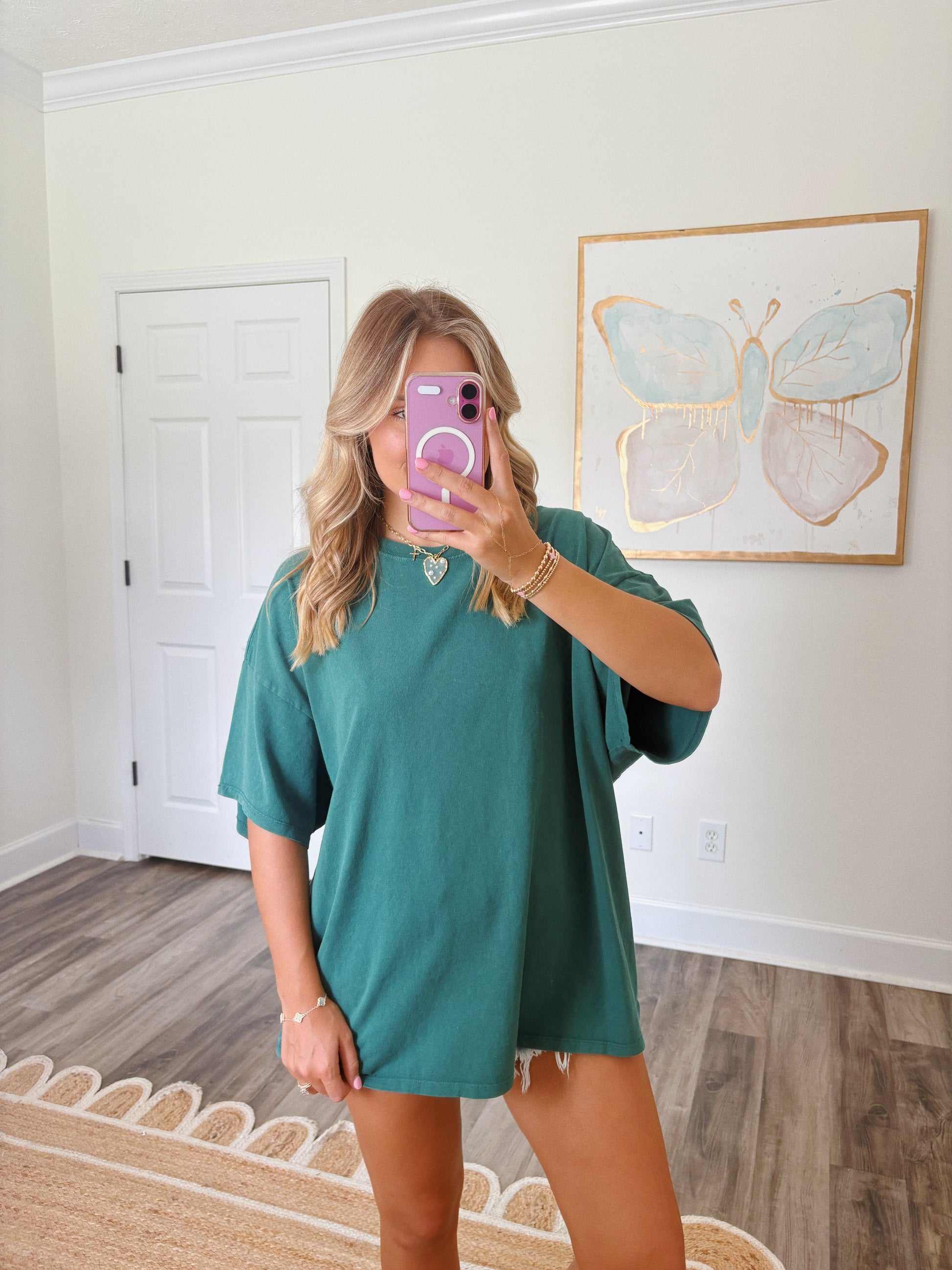 This is the comfiest tee for any casual day! You could pair it with shorts, leggings, or jeans! They run oversized, so if you want a smaller fit, size down! Hallie is wearing a small.