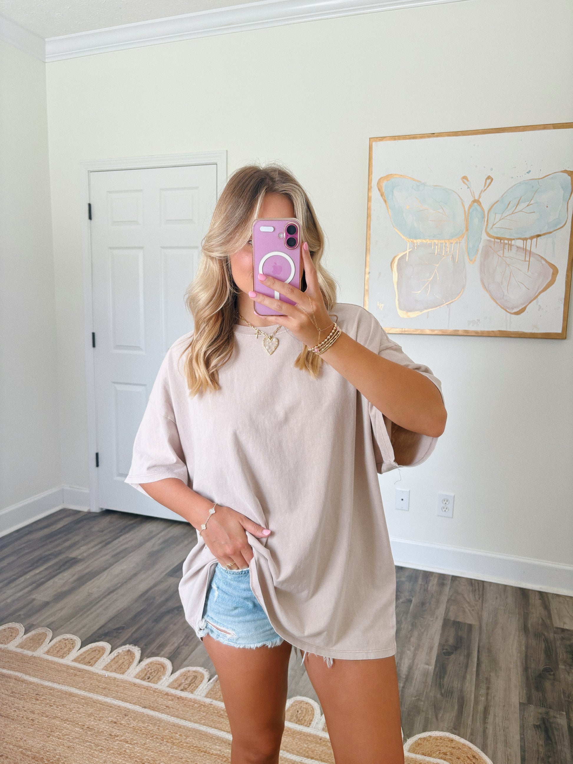 This is the comfiest tee for any casual day! You could pair it with shorts, leggings, or jeans! They run oversized, so if you want a smaller fit, size down! Hallie is wearing a small.