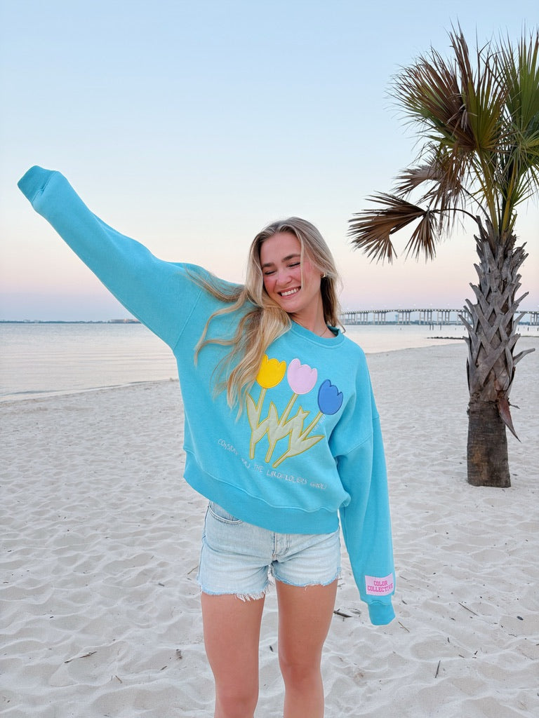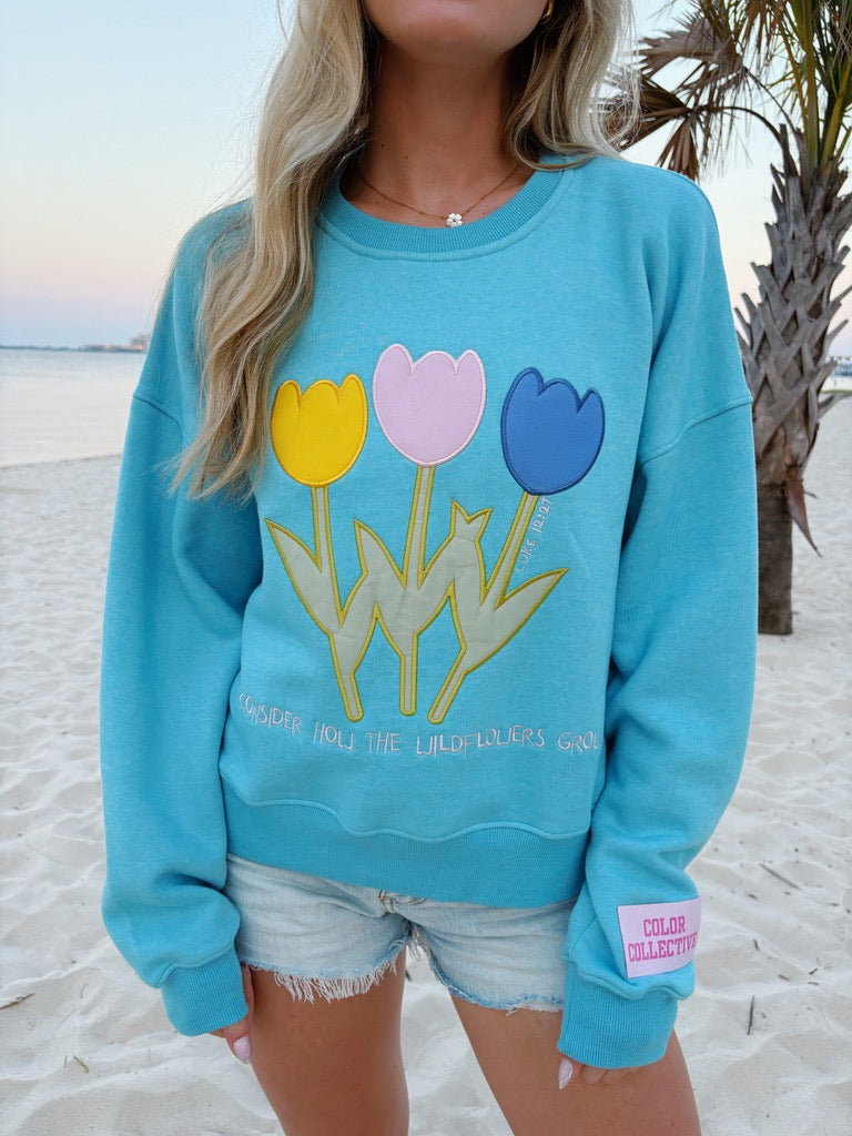 This embroidered crewneck is so soft and cozy! It runs true to size. Size up one for a more oversized fit. The models are wearing a medium for reference. Embroidered: Consider how the wildflowers grow- Luke 12:27.
