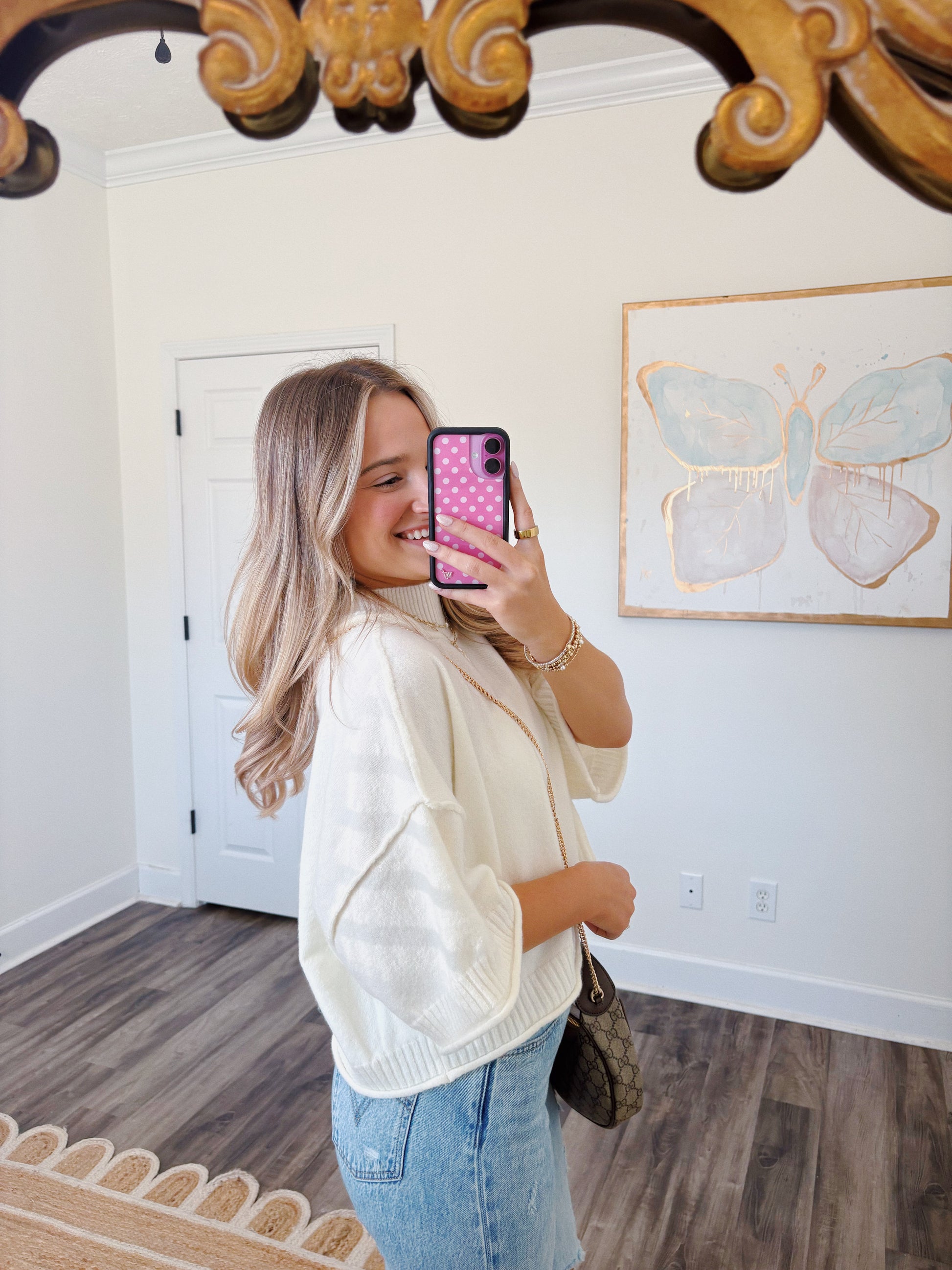 This top is the best basic for spring and summer! It runs true to size with a more cropped length. If in between sizes, size up one. The model is 5'3 wearing a small.