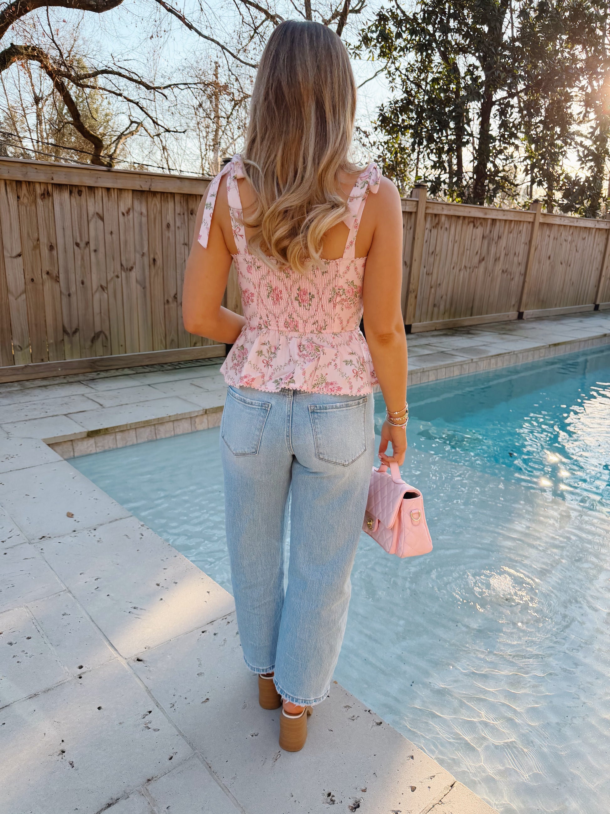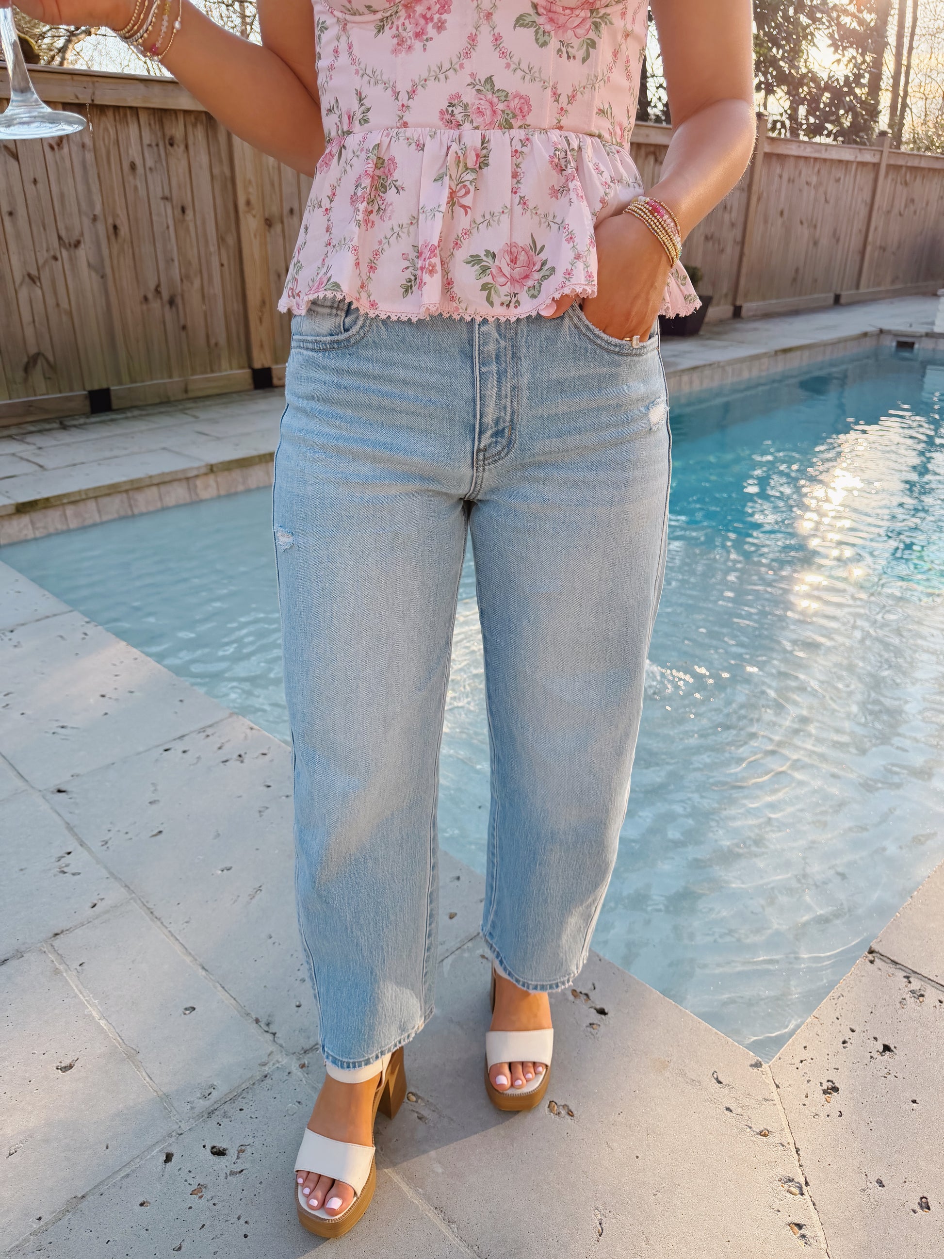These jeans are so comfortable! They are a high rise, light wash, cropped style barrel leg jean. The model is 5'3 wearing a 25 for reference. Sizing: F. Rise: 11" / inseam: 27" / leg opening: 17 1/4"