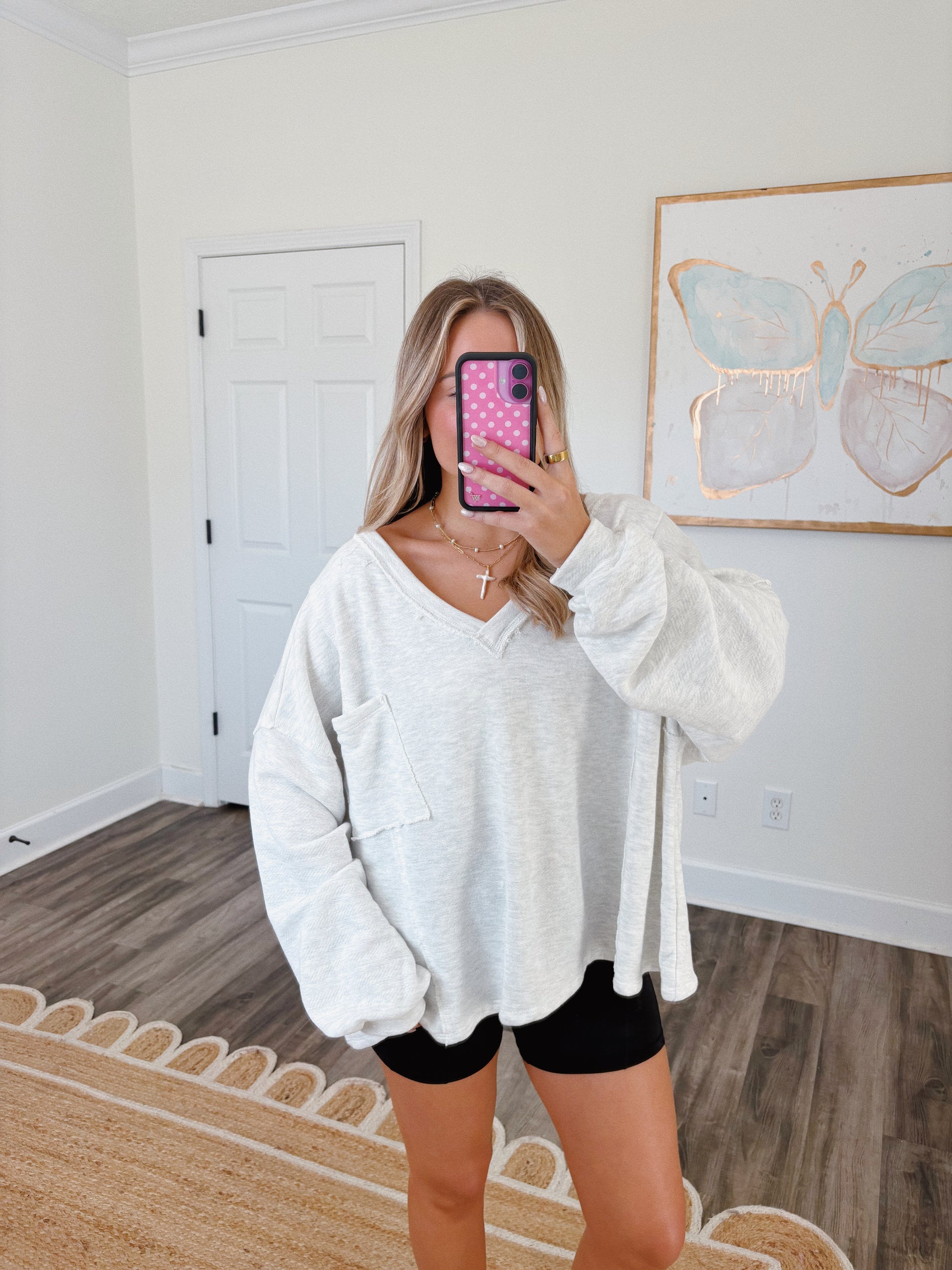 This top is perfect for all of my girls who love an oversized/cozy look! It is perfect dressed up or down. The model is 5'3 wearing a small.