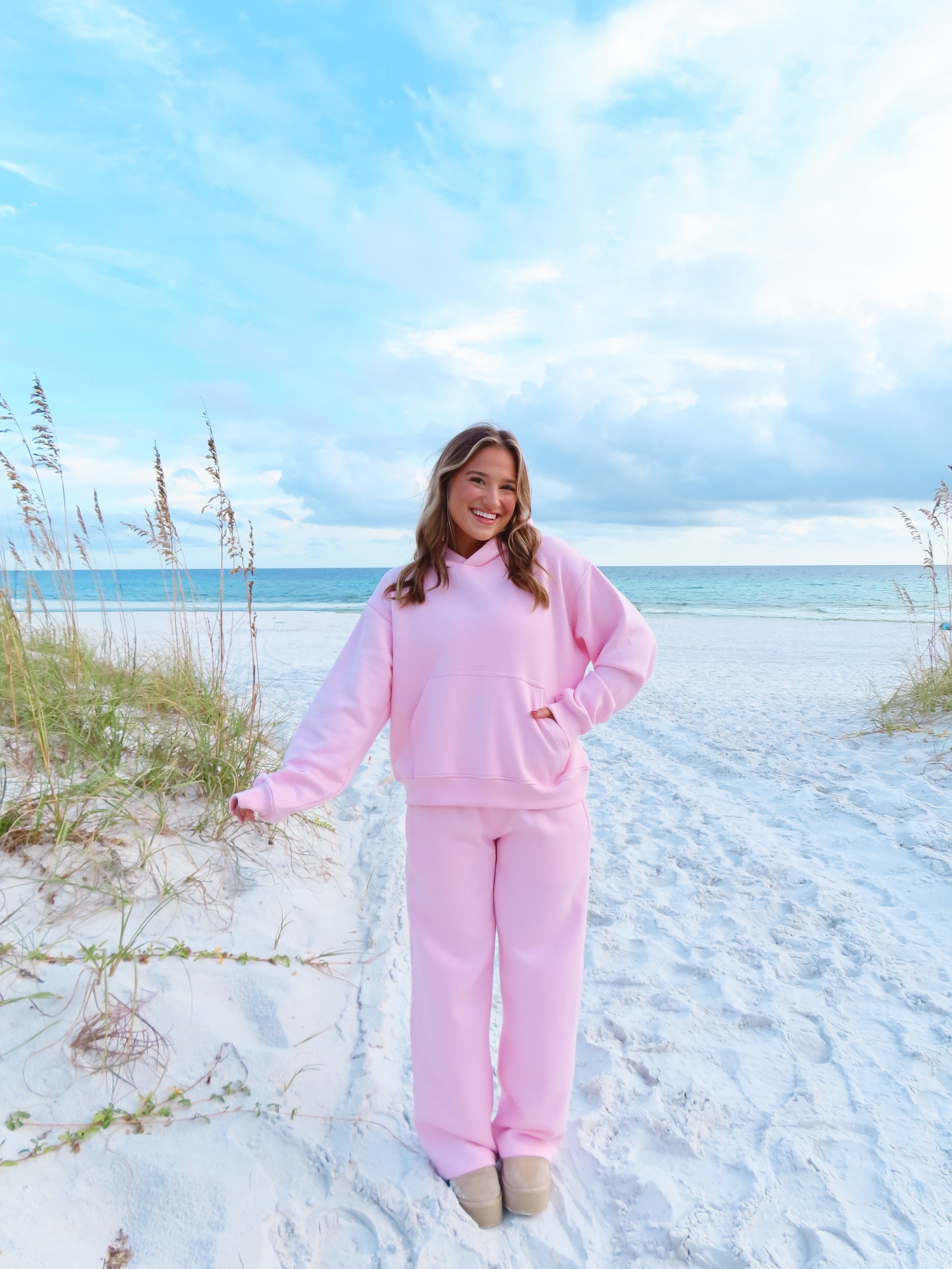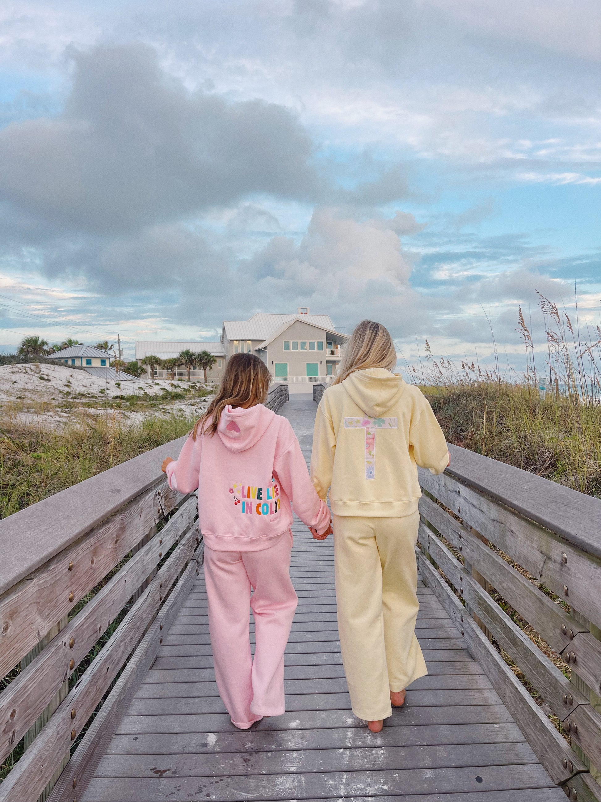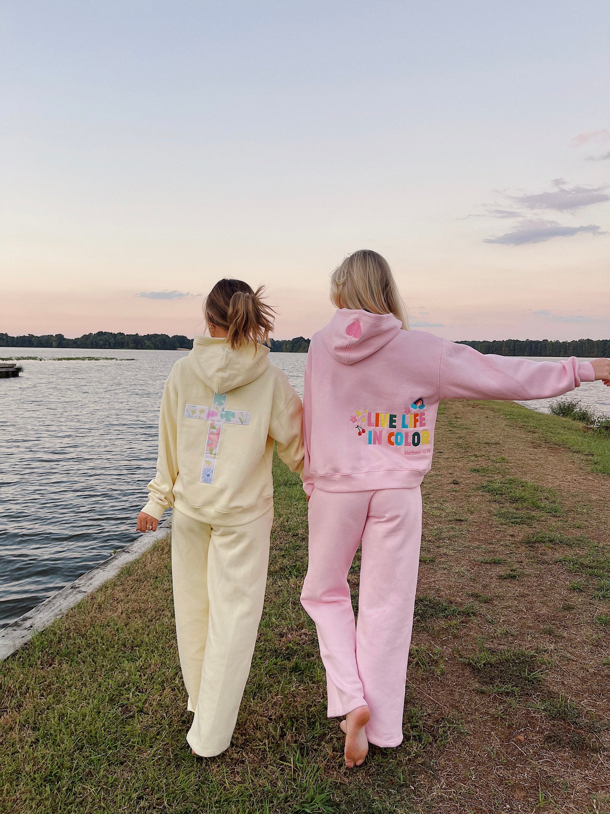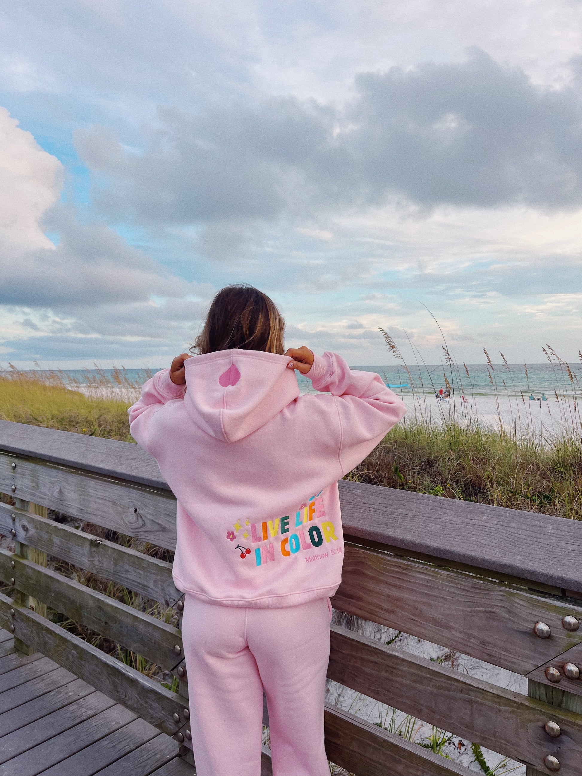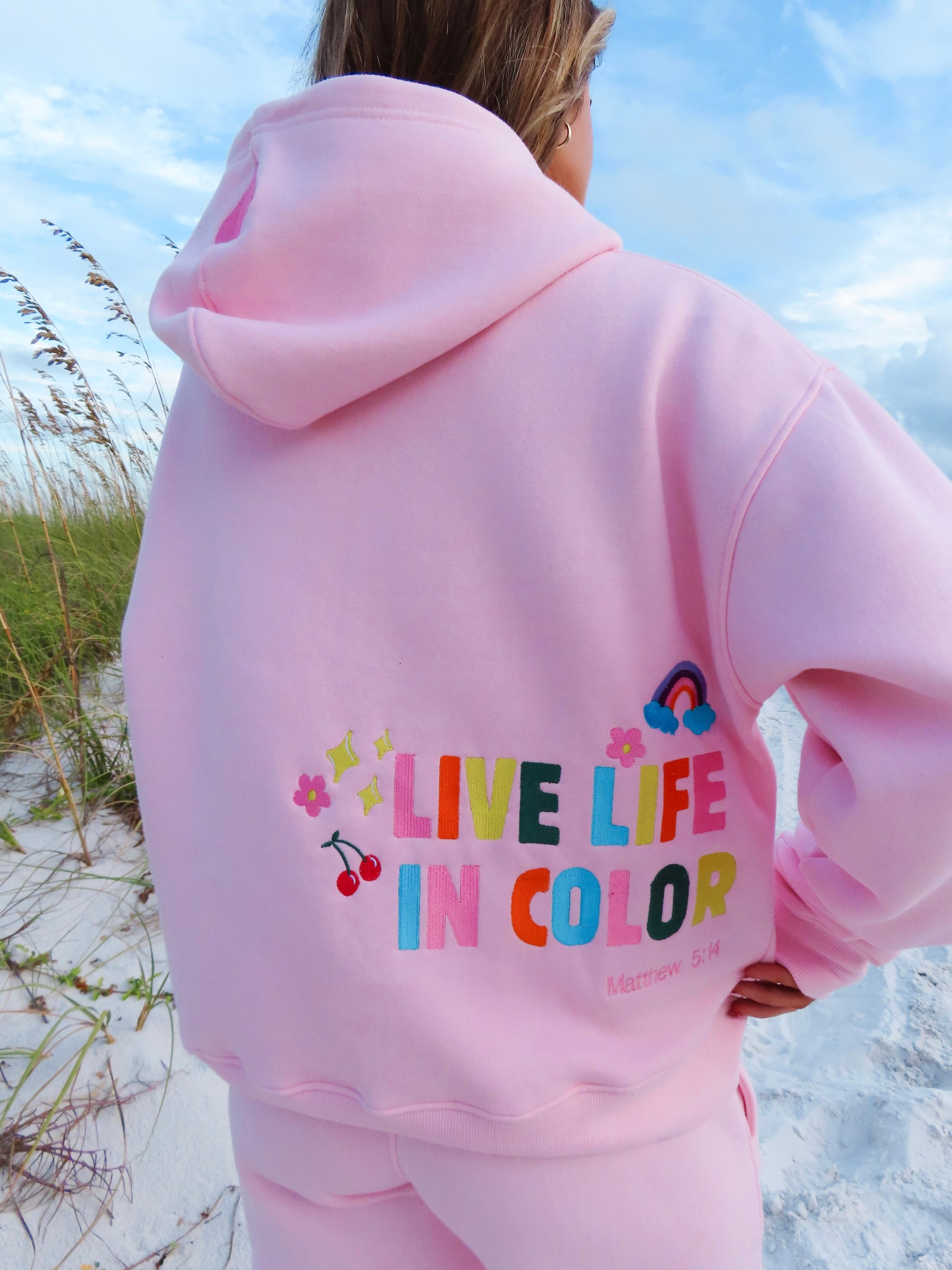 This set is an original design by Color Collective! It has "Live Life In Color" embroidered on the back of the sweatshirt, and an embroidered heart on the hood. It is SO comfy. It has a fleece lining, and runs true to size. The model is 5'3 wearing a small.