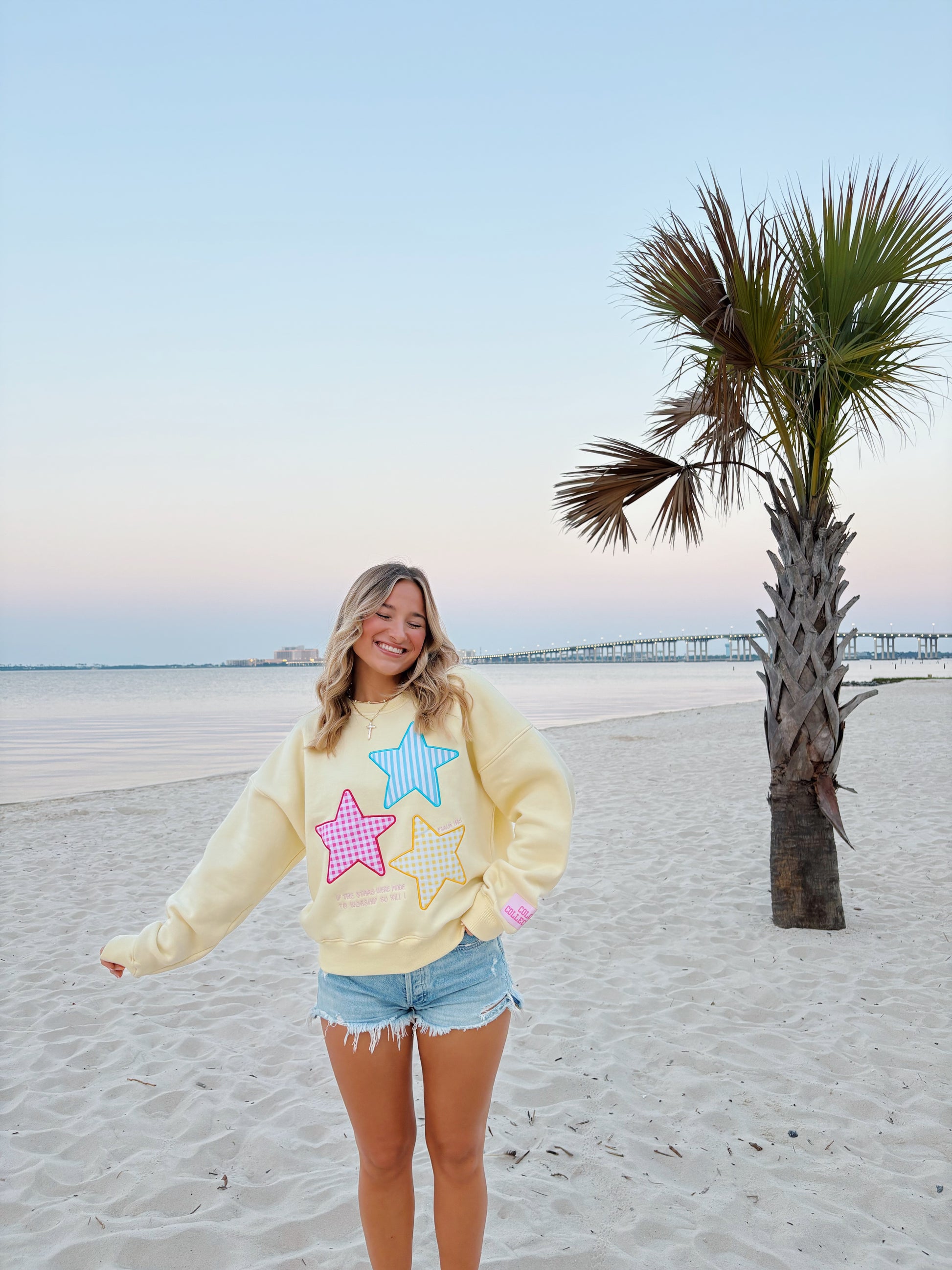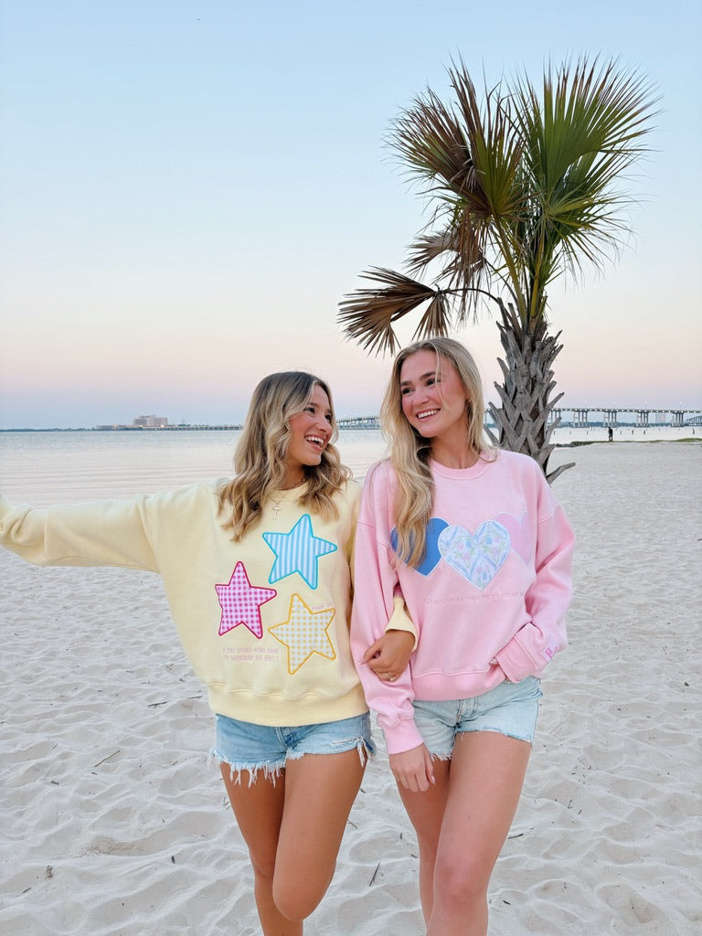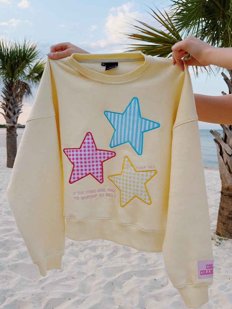 This embroidered crewneck is so soft and cozy! It runs true to size. Size up one for a more oversized fit. The models are wearing a medium for reference. Embroidered: If the stars were made to worship so will I- Psalm 146:3.