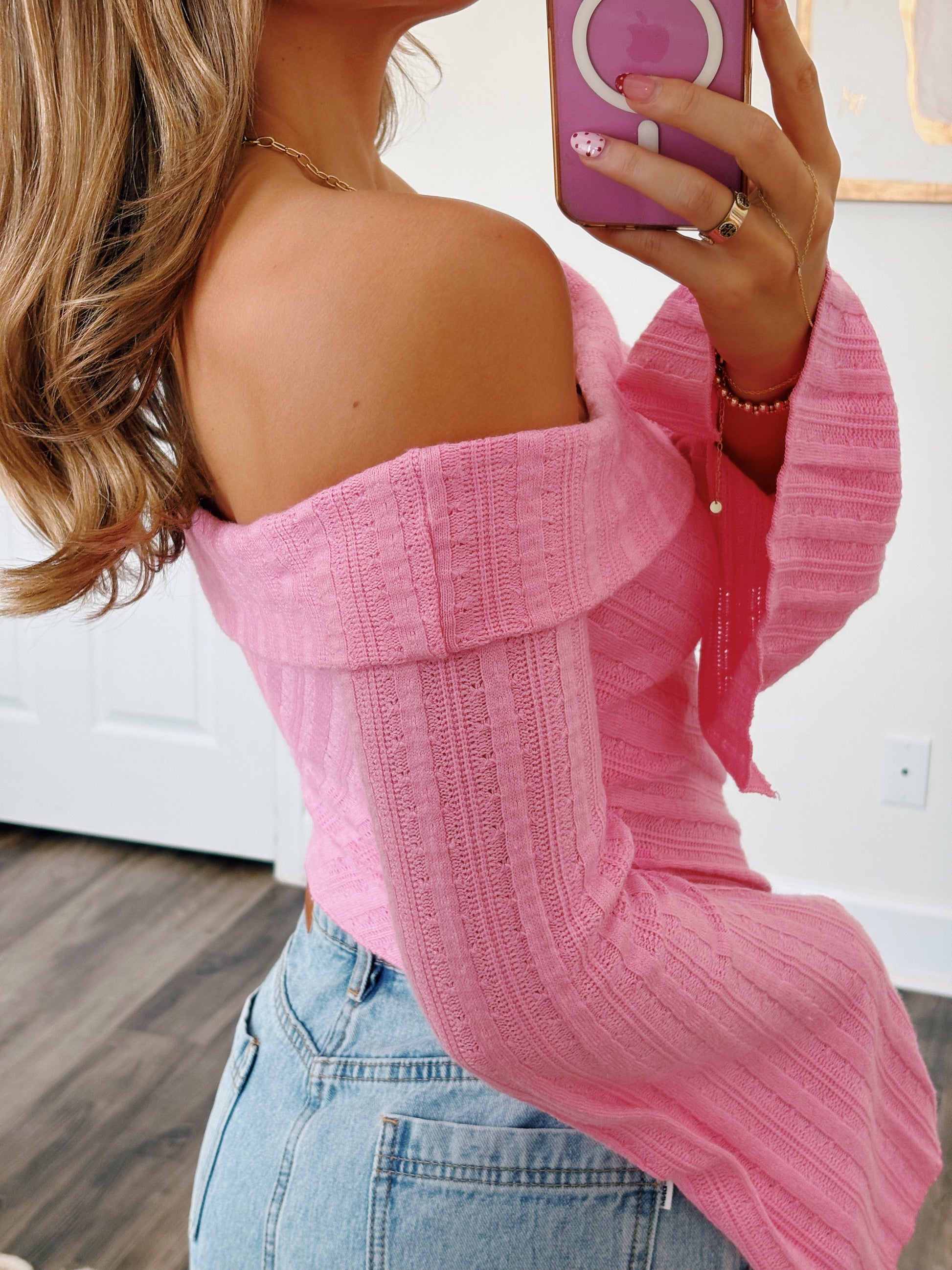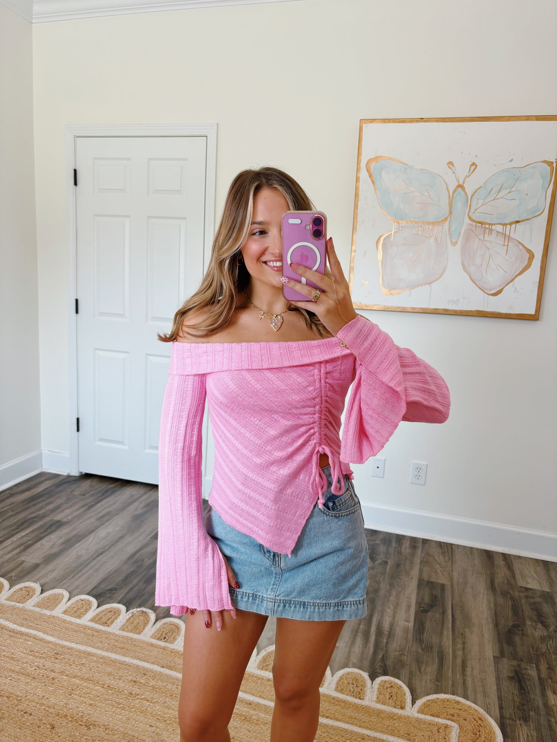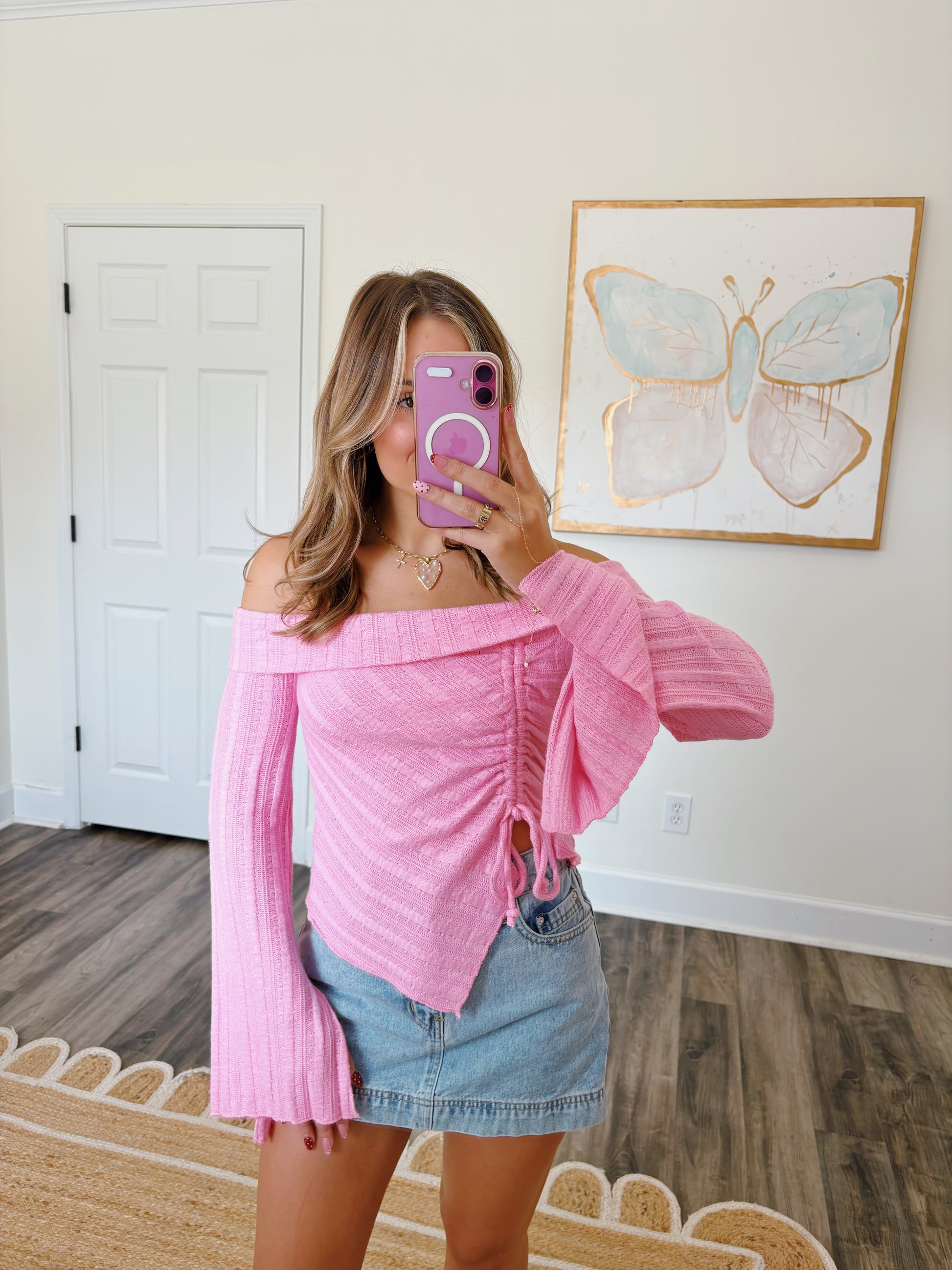 This top is perfect for your next date night! It is off the shoulder with an adjustable tie in the front. The flare sleeves and knit material are so fun! It runs true to size, and the model is wearing a small.