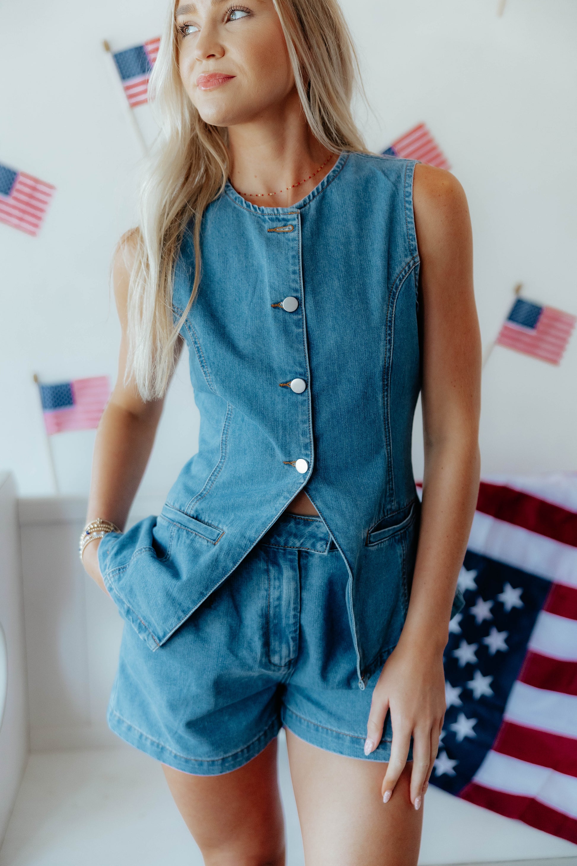 This denim set is so cute, and a staple for your closet!! Kordelia is 5'10 and wearing a small.