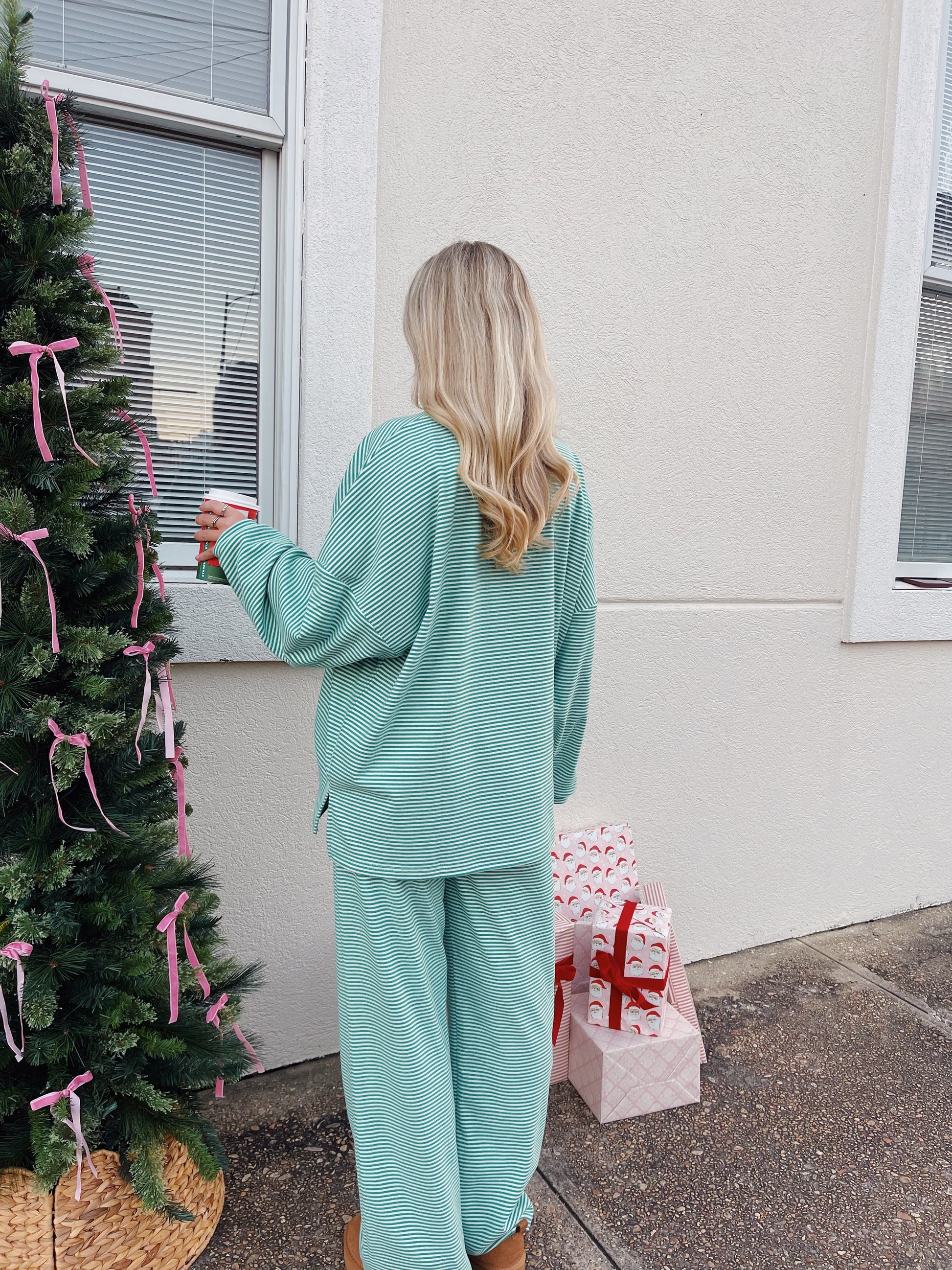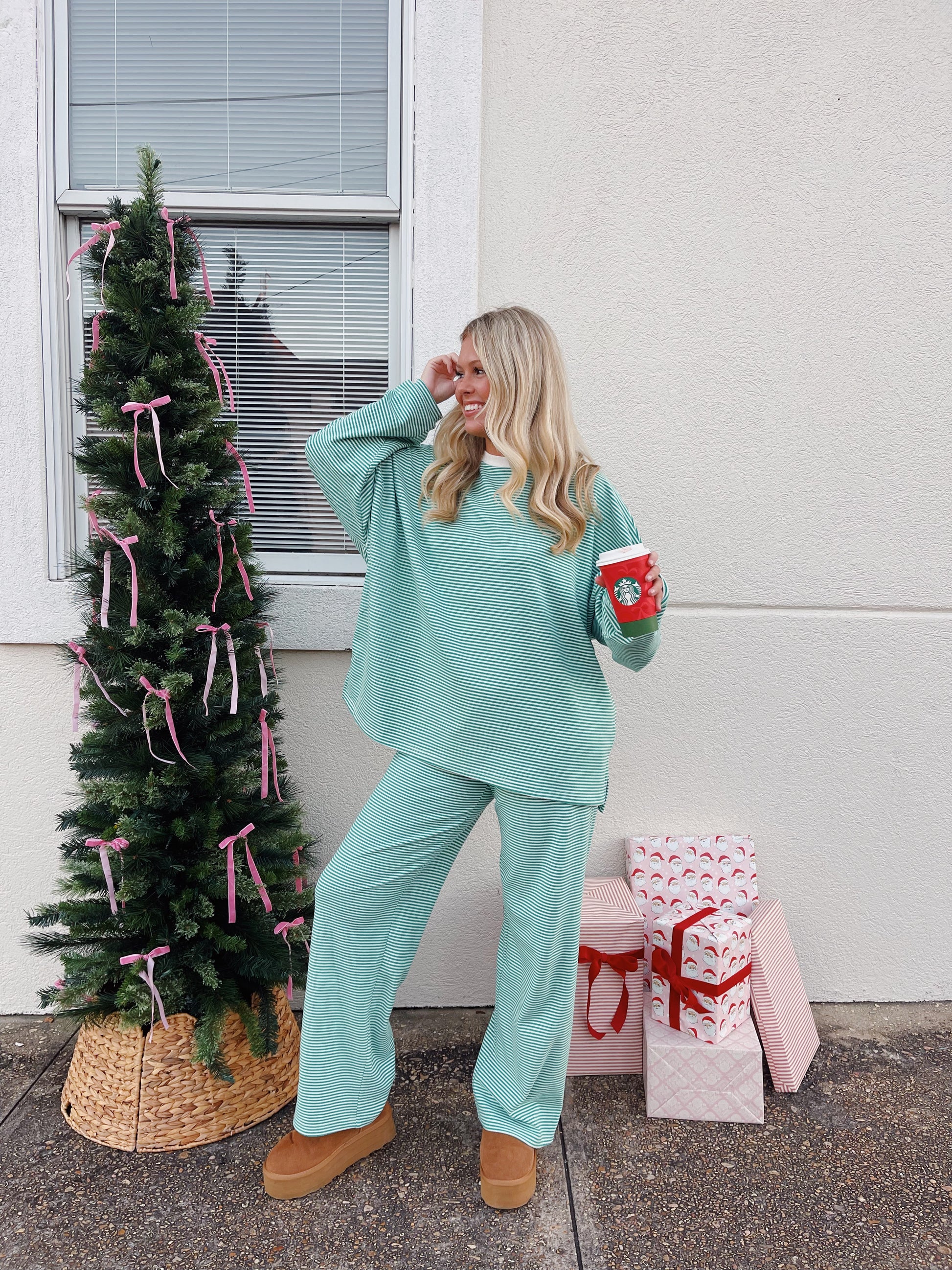 This top is so soft! Grab the Mistletoe Striped Bottoms for a matching set! It runs true to size, and the model is 5'7 wearing a S/M.