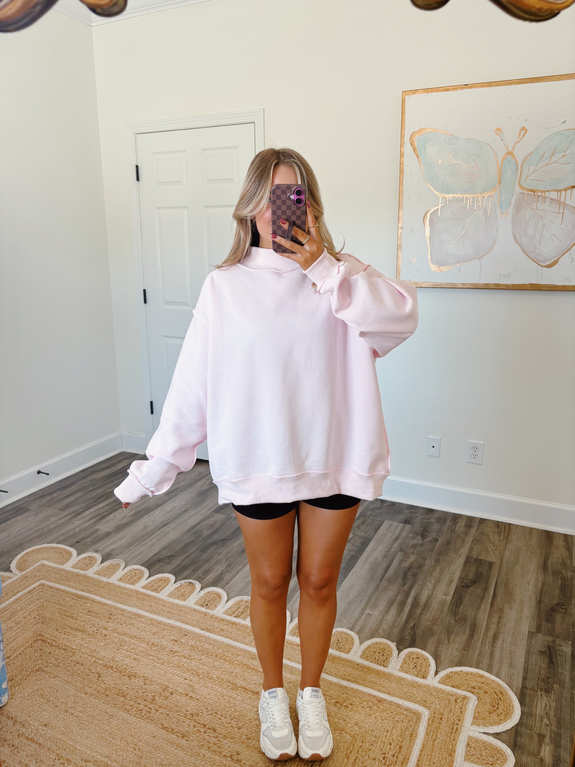 The coziest mockneck for fall! It runs true to size with an oversized look. The model is wearing a S/M. Fleece lined.