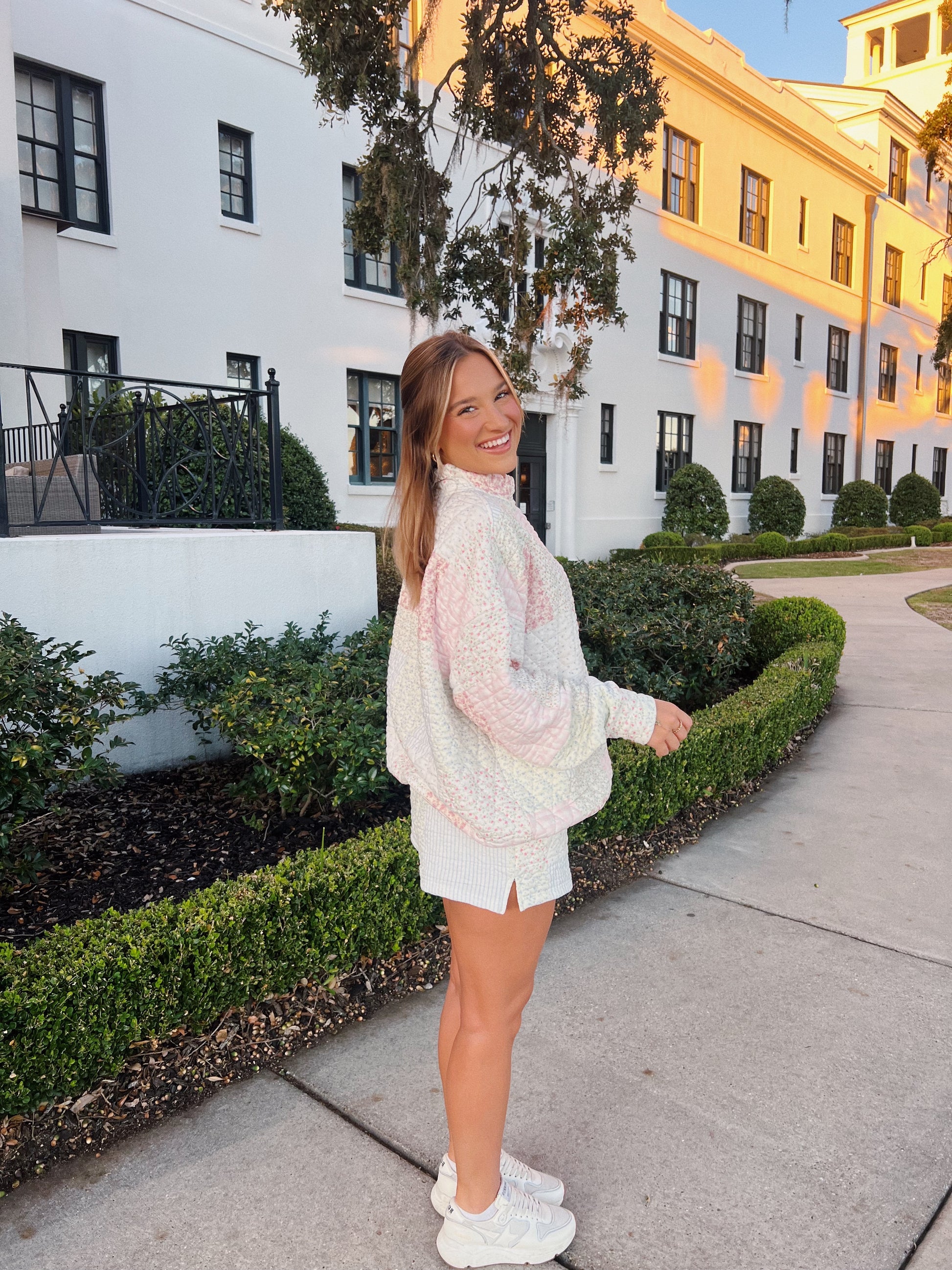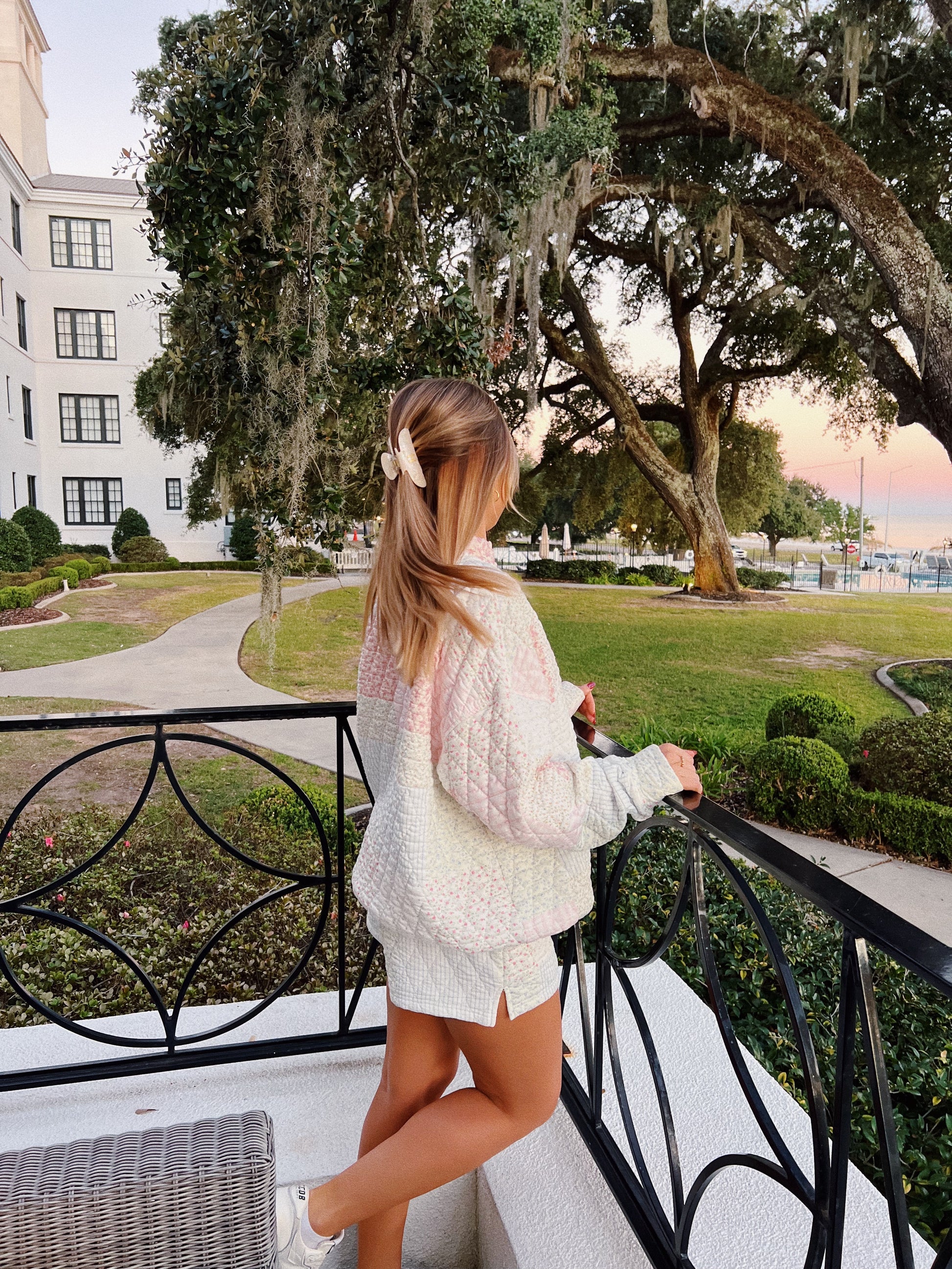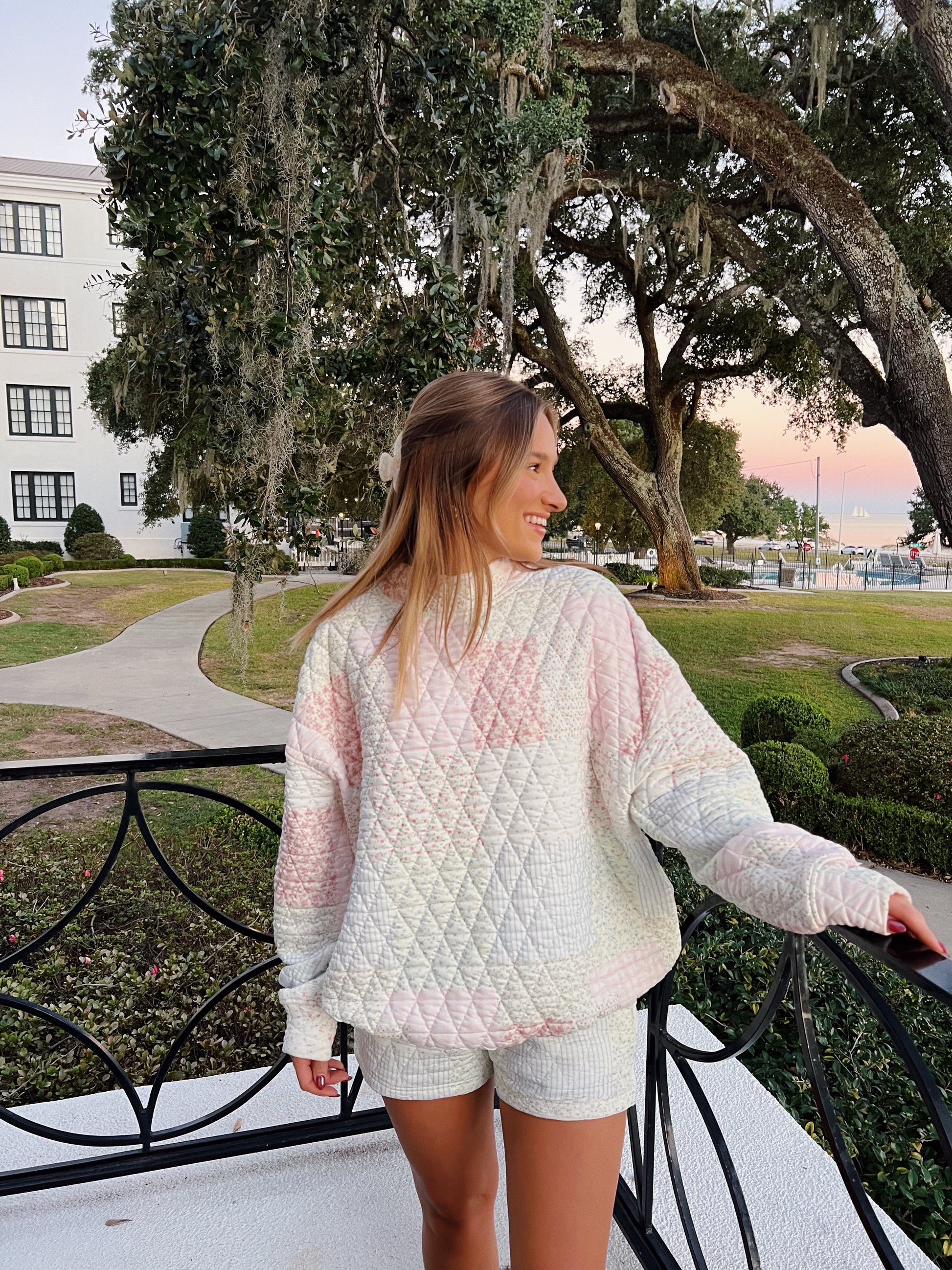 This quilted set set is perfection! The mock neck has a slightly oversized fit, while the bottoms run true to size. The shorts have an adjustable tie waistband. The model is 5'3 wearing a small for reference. BRAND: Happy Camp3r