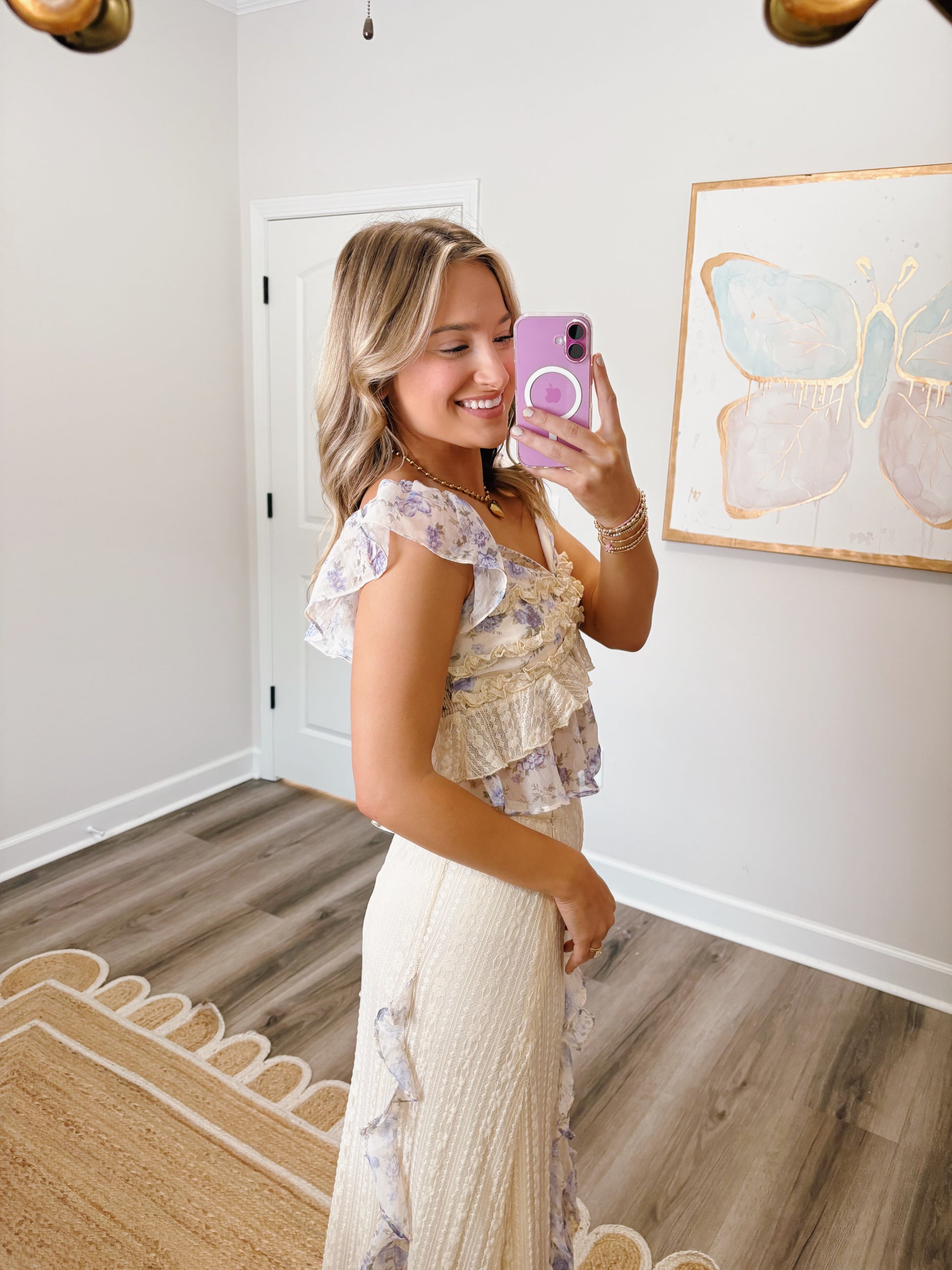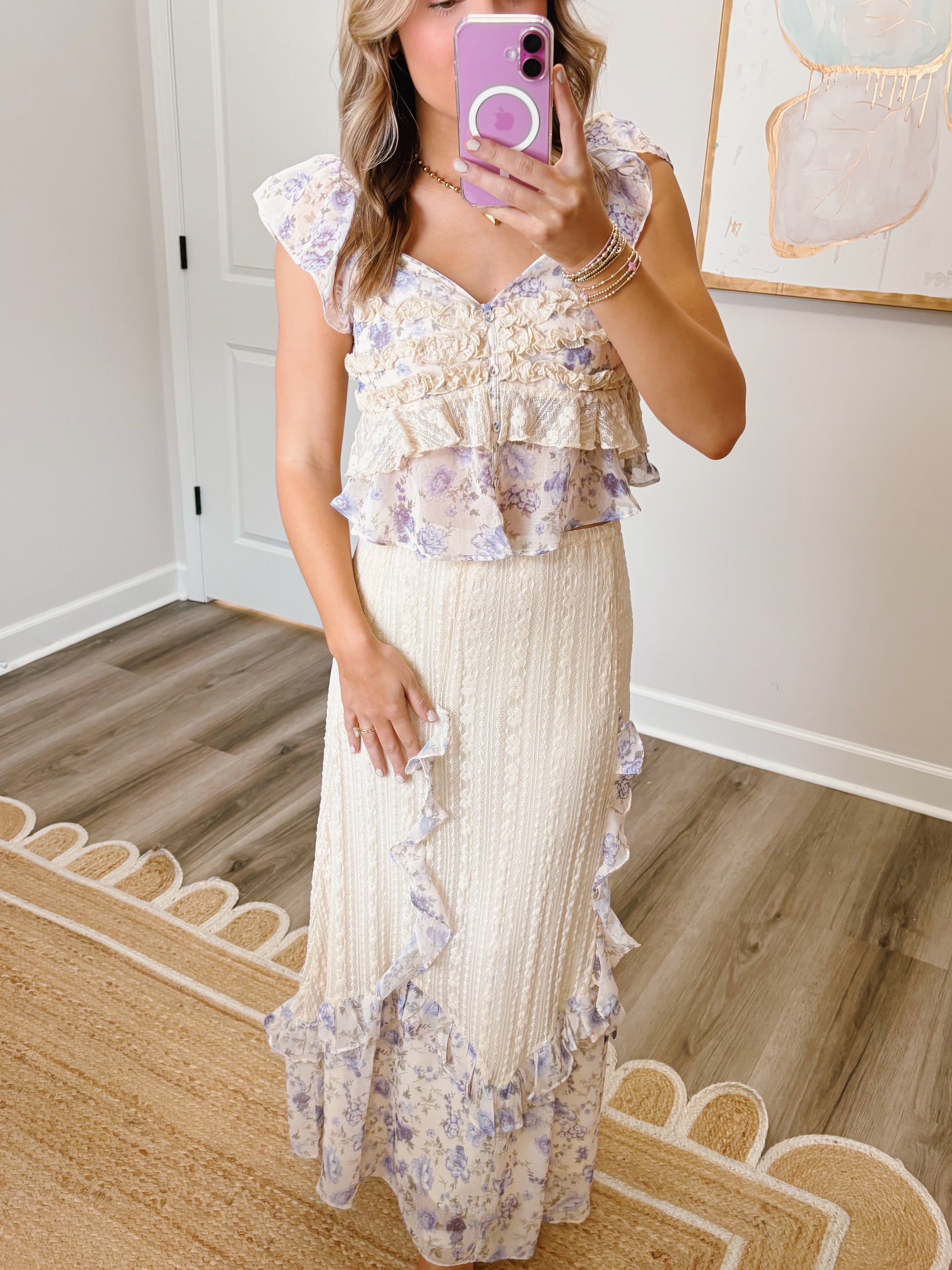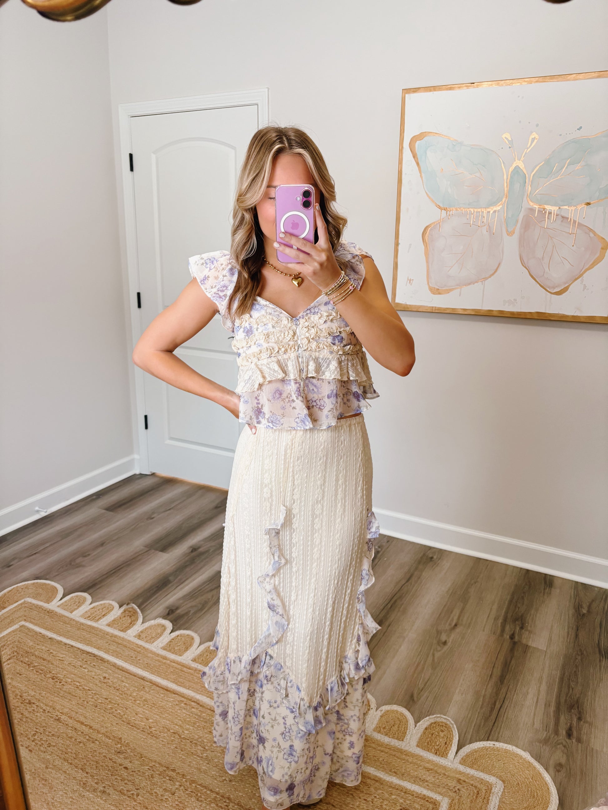 The most stunning set! Featuring a zip up maxi skirt with an elastic waist band. It runs true to size. Model is 5'3 wearing a size small.