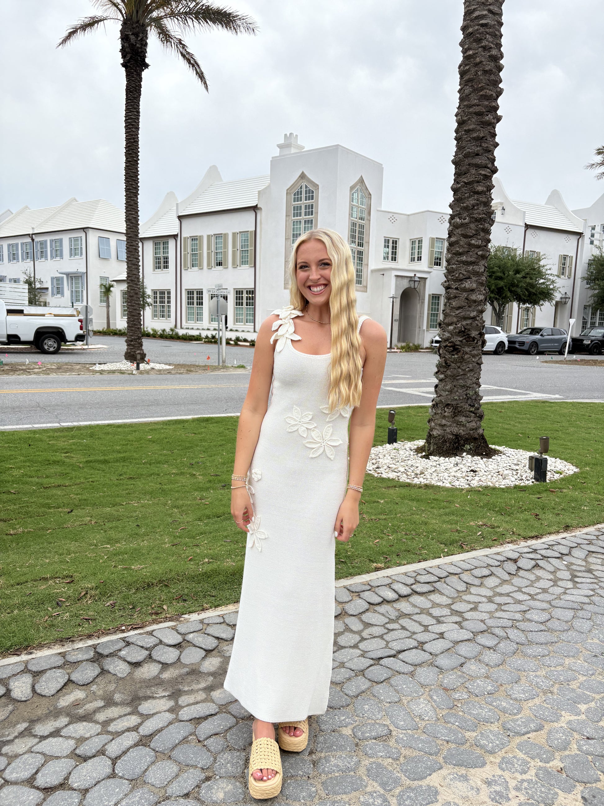 The most perfect summer/vacation dress! It runs true to size with a tighter fit. The model is in a small for reference. This is a knit material. We recommend wearing light/nude undergarments!