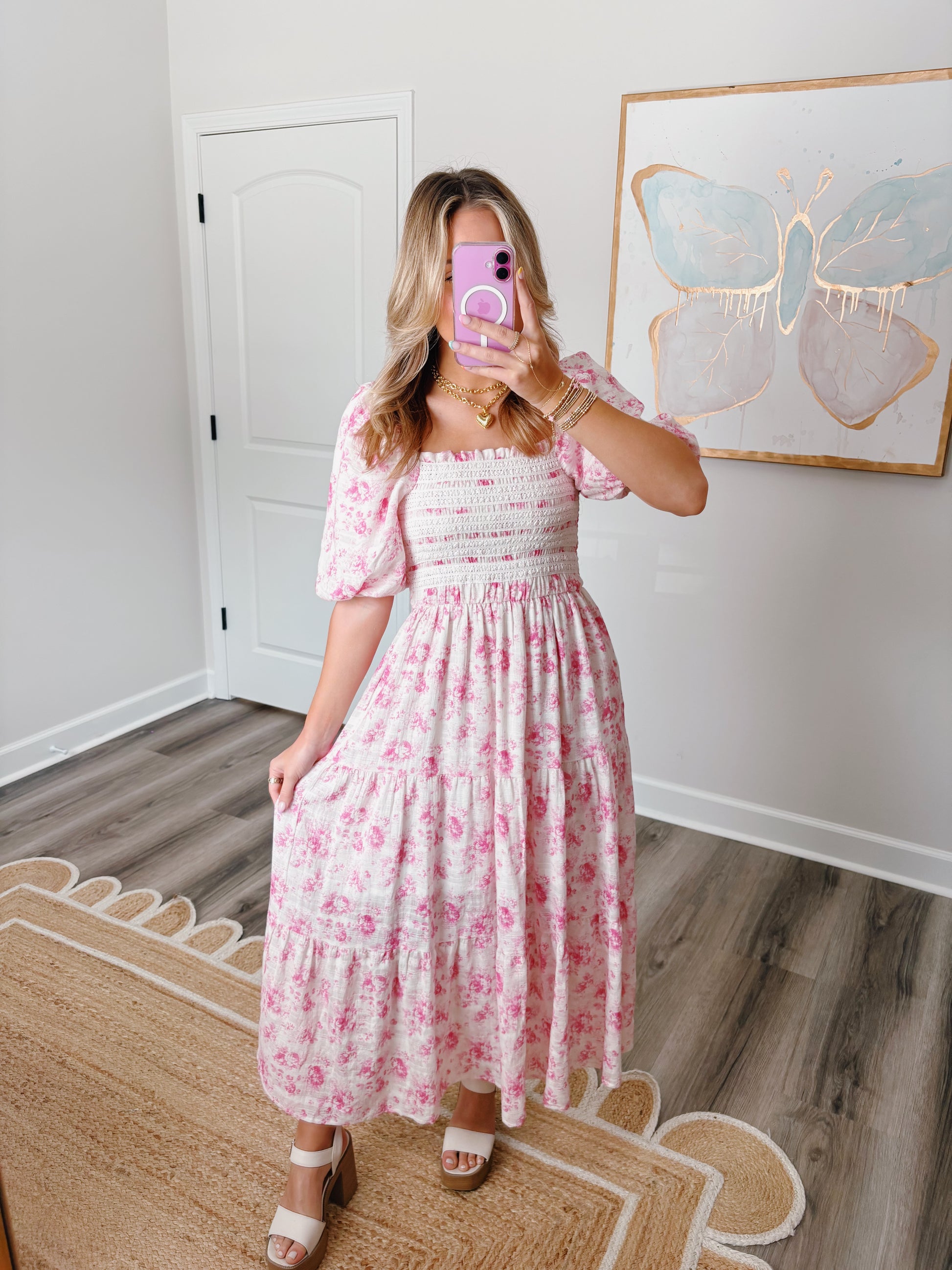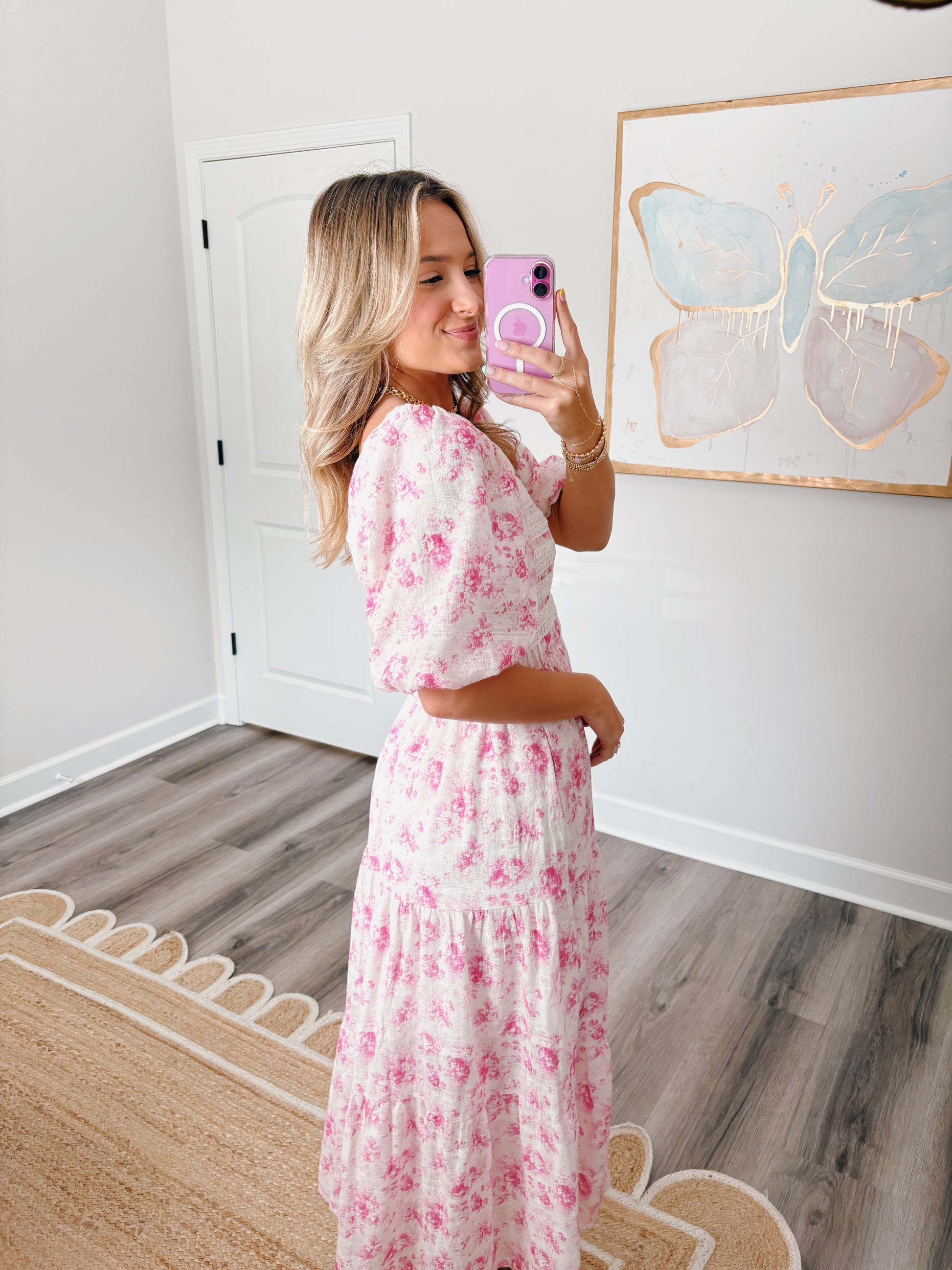 This stunning maxi is super comfortable, stretchy, and has pockets! It runs true to size. The model is 5'3 wearing a size small.