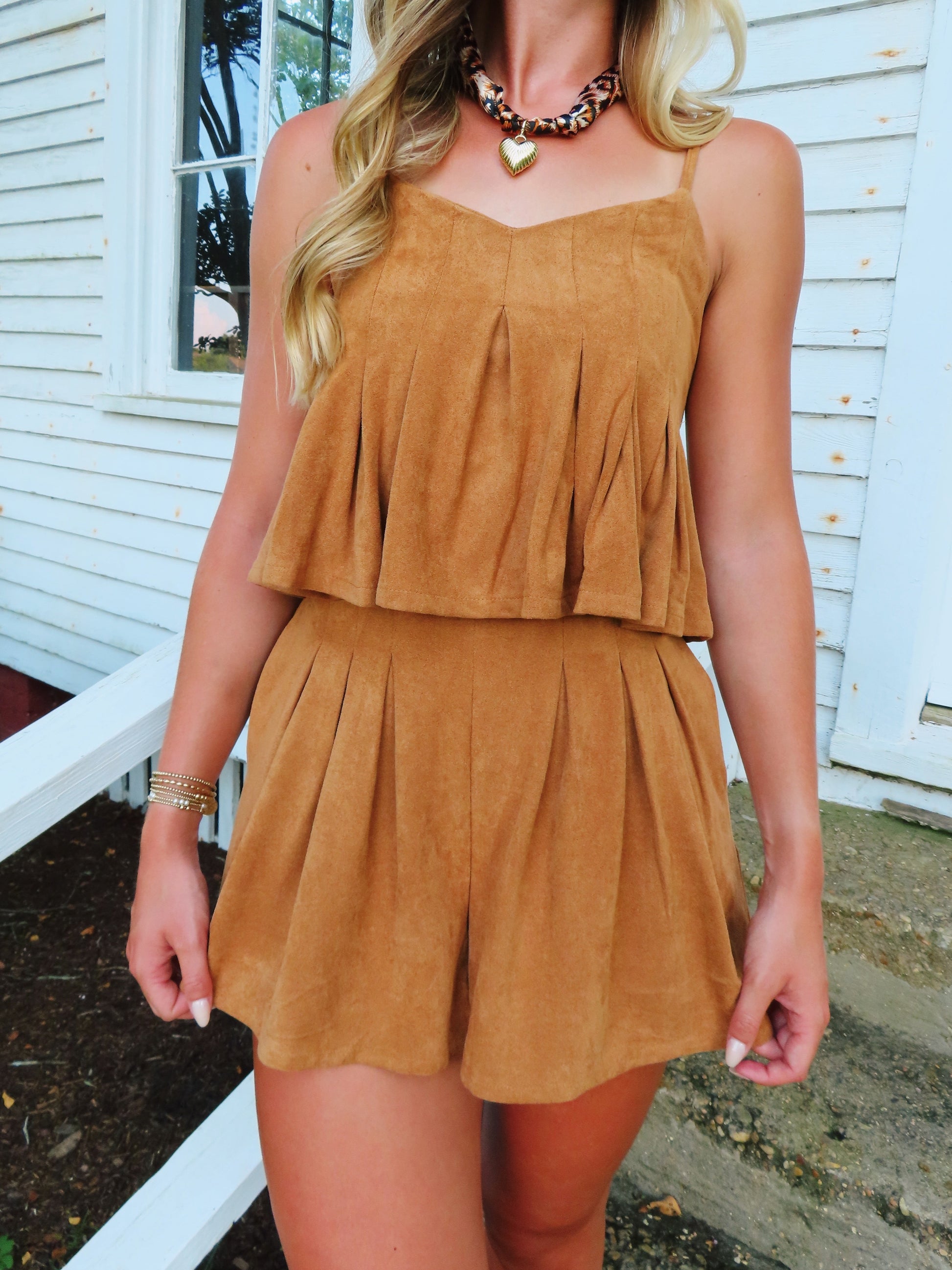 This suede set is SO cute and perfect for fall and gamedays! Pair it with your favorite heel or boots. It runs true to size.