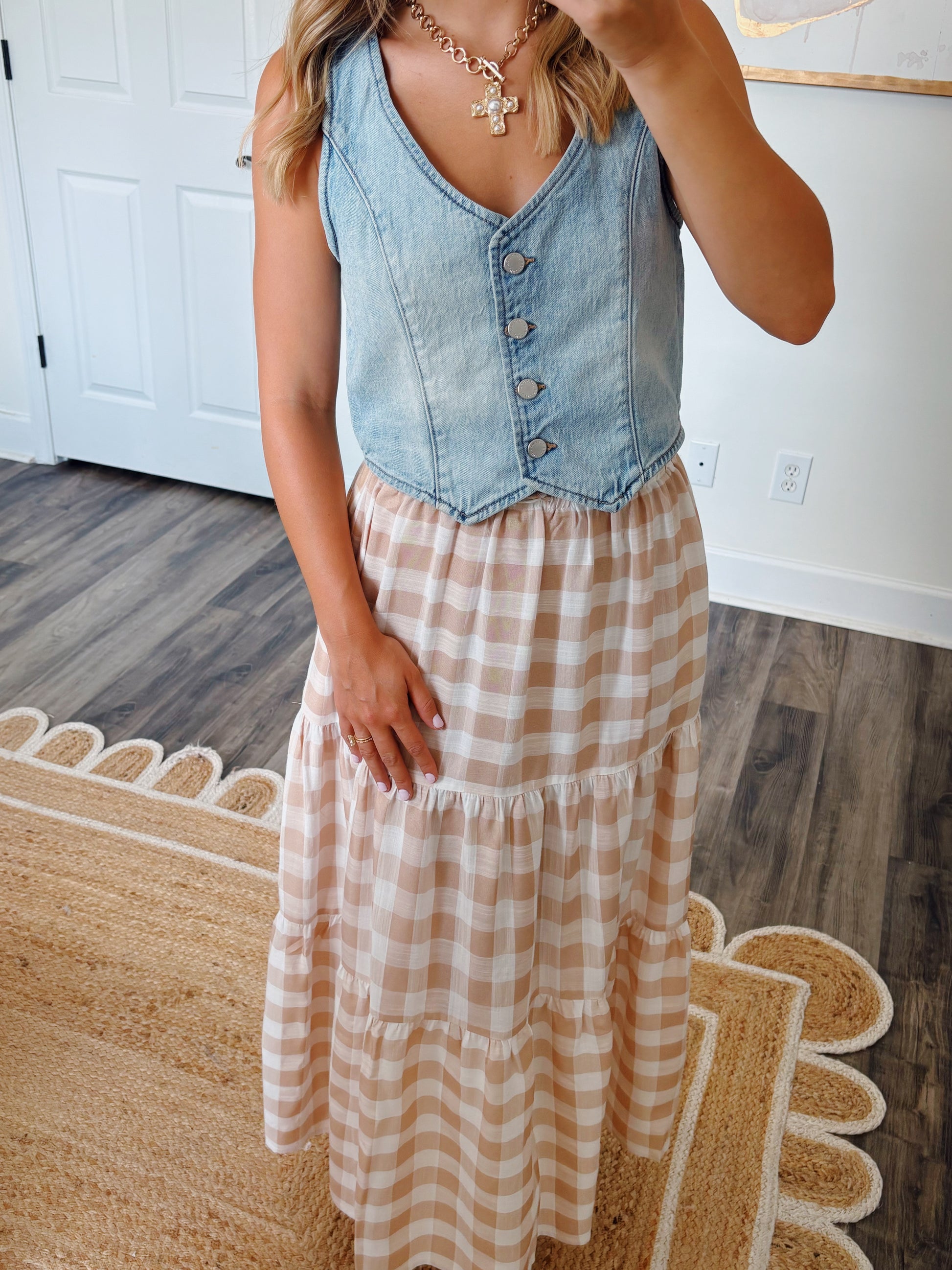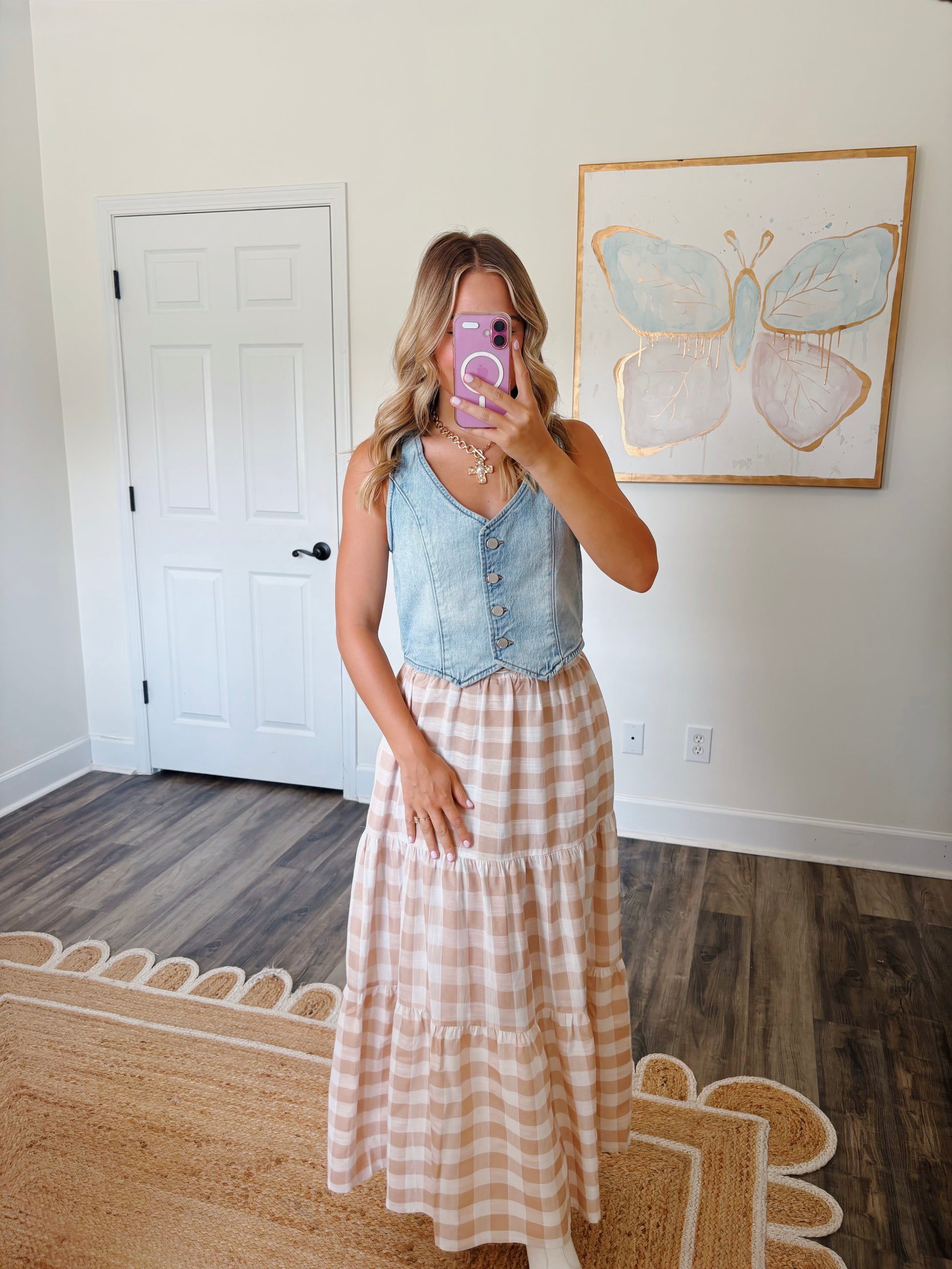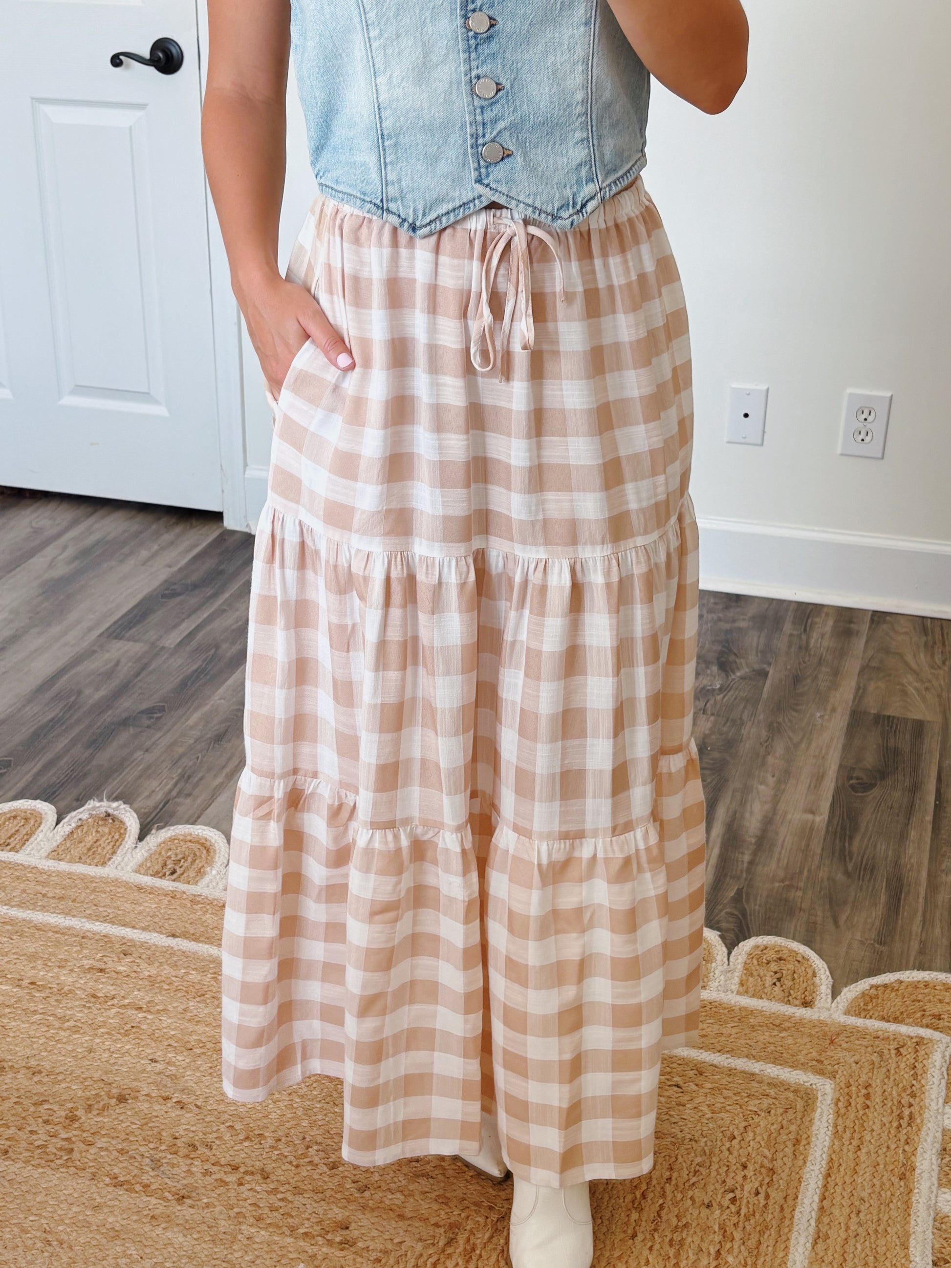 This maxi skirt is a staple for all year round! Pair it with the Light Wash Denim Vest or the White Scalloped Baby Tee! It has pockets and runs true to size. Hallie is 5'3 and wearing a small.