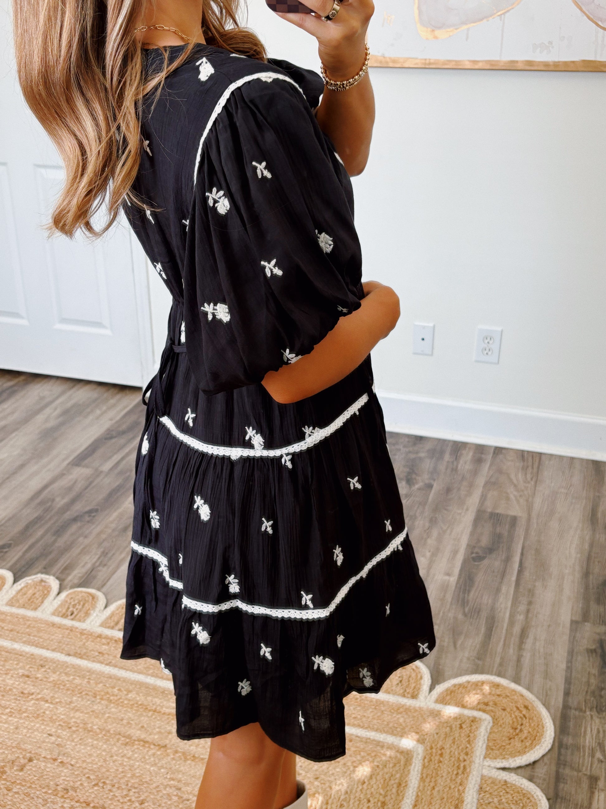 A dress to throw on for any occasion! Pair it with sneakers, heels, or your favorite fall boots. It runs true to size. The model is 5'3 and wearing a small.