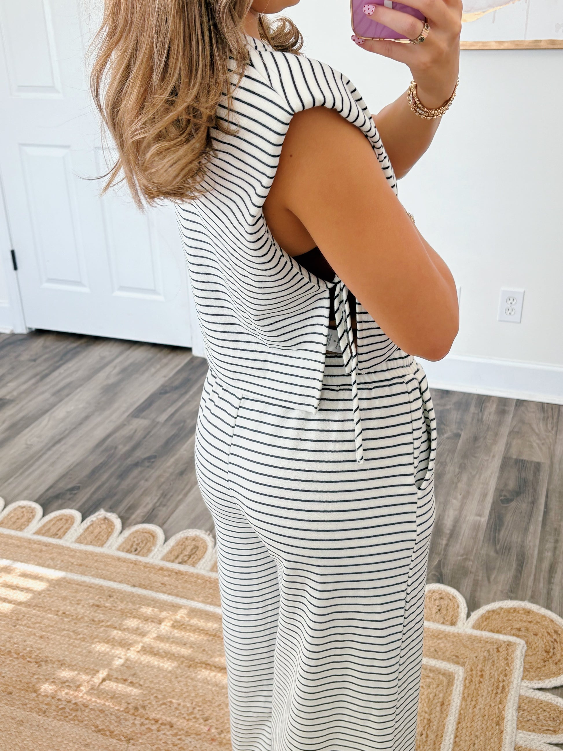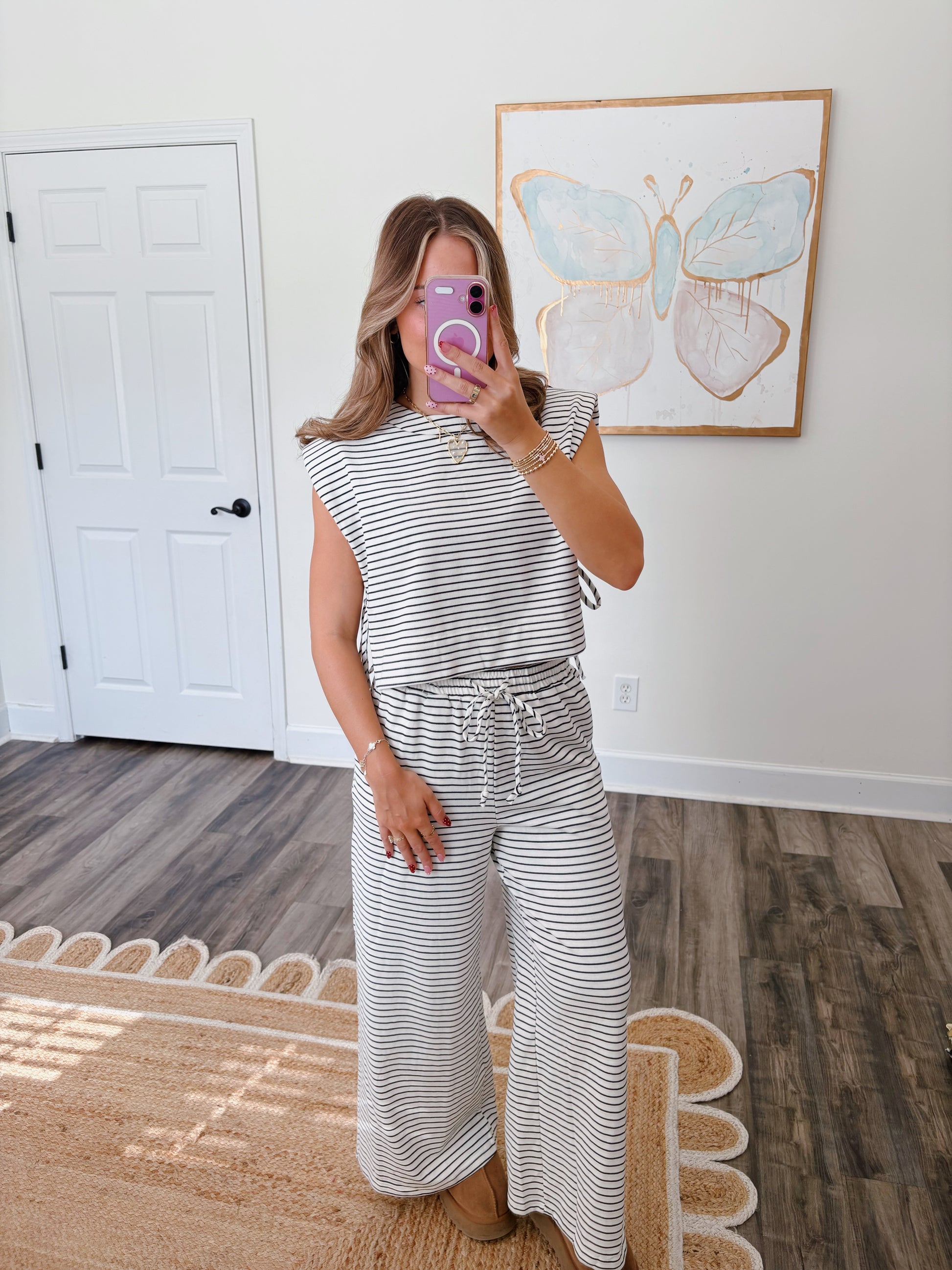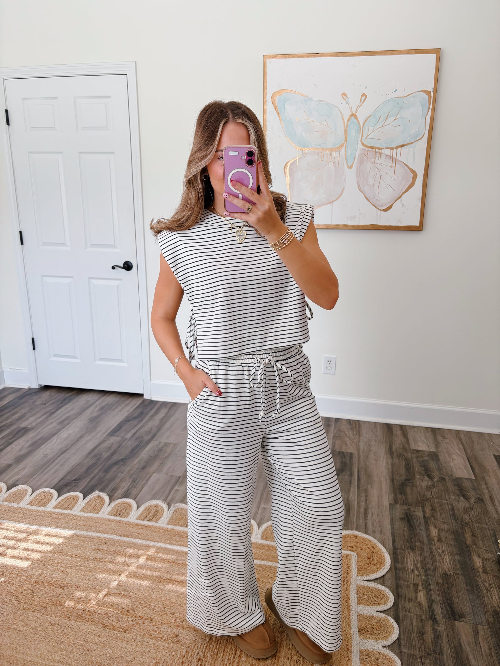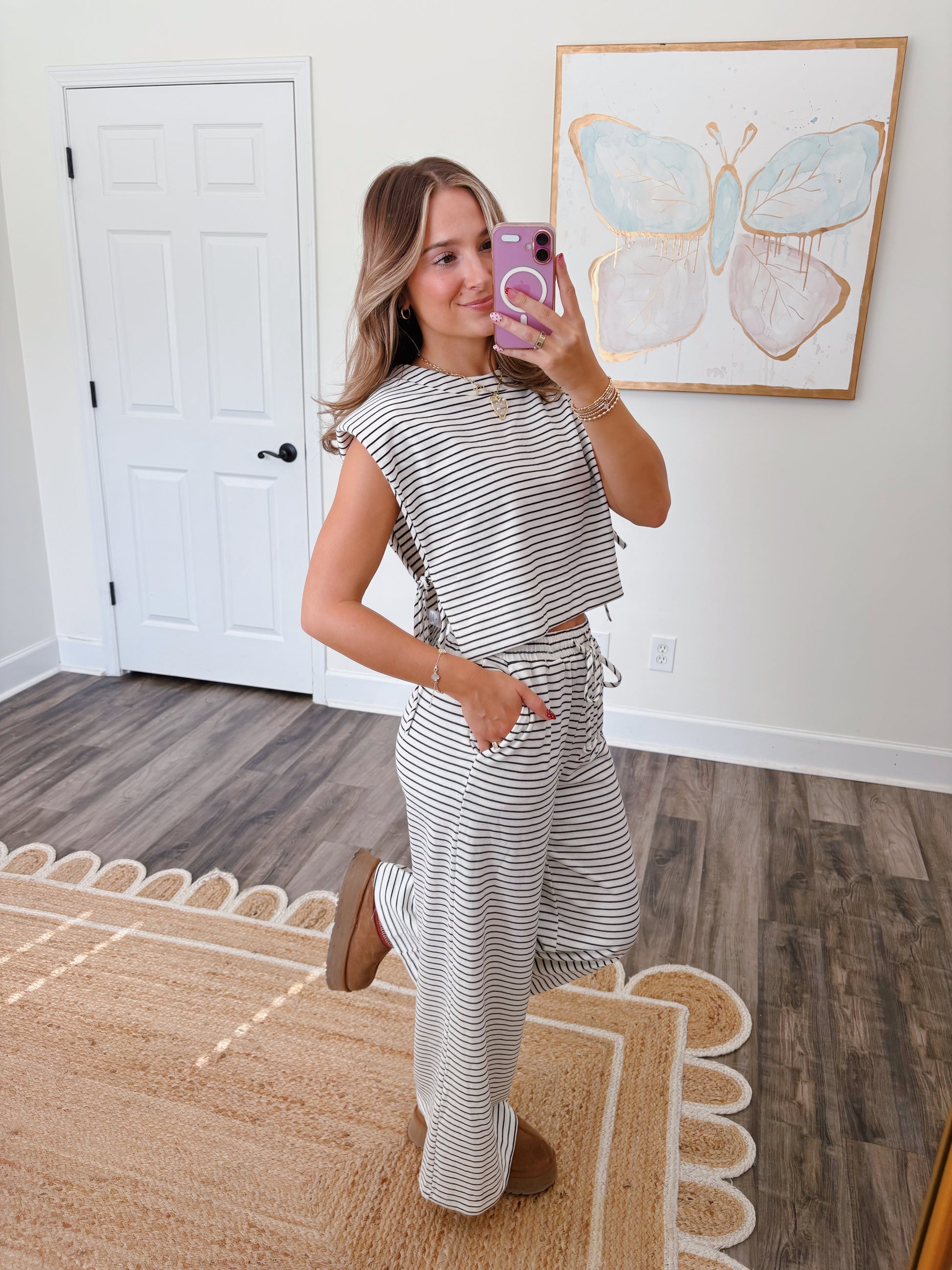 This set is perfect for a chill day at home or a busy day running errands! The top has side ties and a slight padding in the shoulder. The pants have pockets and adjustable drawstrings. It runs true to size. Hallie is 5'3 and wearing a small.