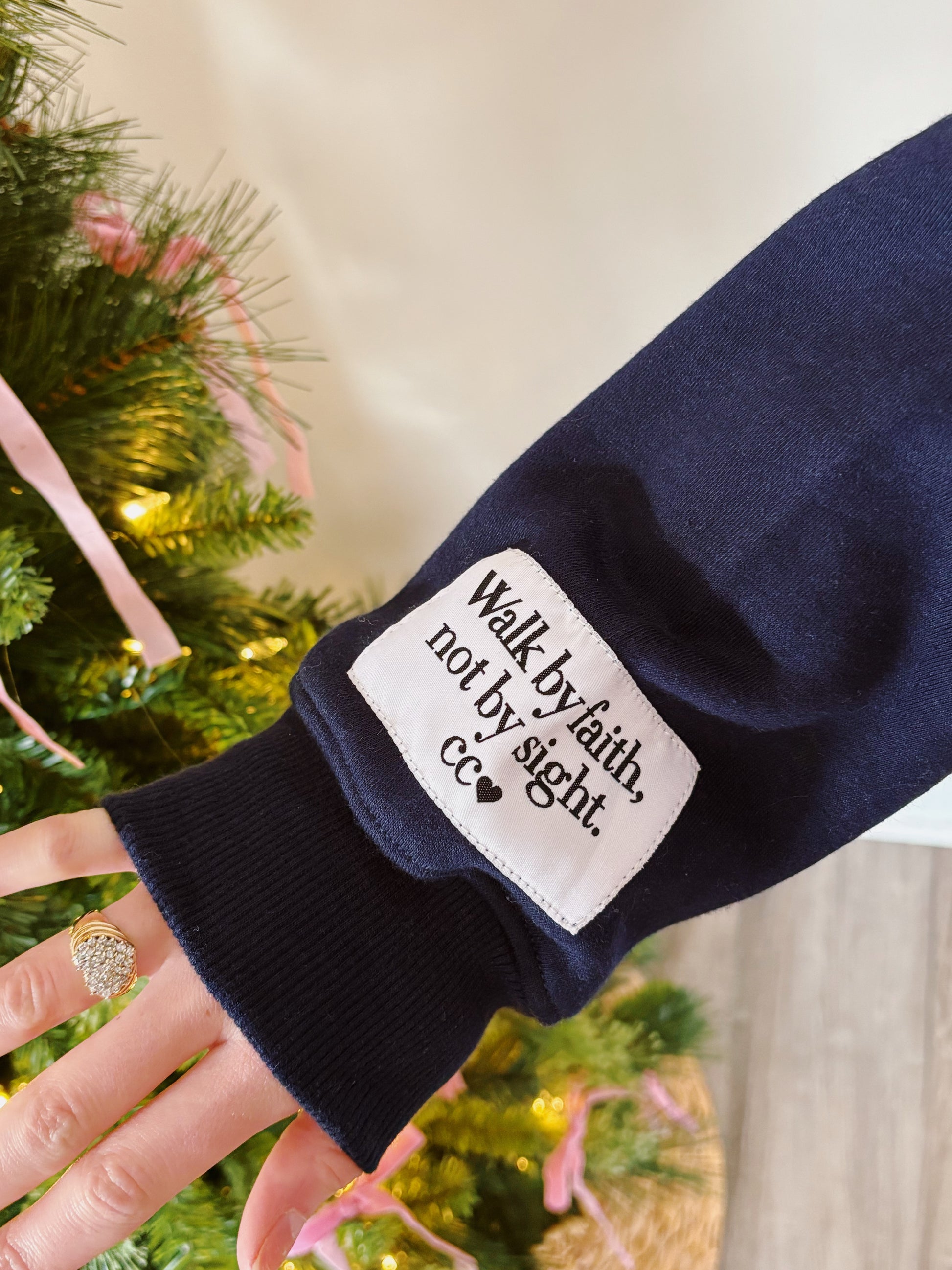 This mockneck is perfect to pair with our navy biker shorts! It has a white patch on the sleeve that says, "Walk by faith, not by sight"- a biblical truth to remember on the daily! The mockneck has a fleece lining—the materials consist of 65% Cotton and 35% Polyester. Size up one for a more oversized fit! The model is wearing a medium for reference.